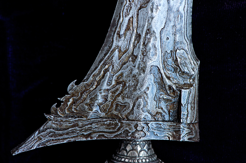A South Sumatra keris of 11 Luk (waves), the blade is an old one estimated as first half of the 19th century, and had its origin in West Java, probably Banten, indicated by the concave gandhik and the boto rubuh blumbangan. This is an old blade of very high quality, the pamor is wos wutah, but the pamor of the gonjo is a complex pamor miring, the gonjo is bekas kinatah, that is, it once had kinatah work, but all that can be seen of that work now is the carving that supported it and a few specks of gold. The garap (workmanship) is masterful. This is a very high quality wilah (blade), and is certainly the work of a skilled empu.
