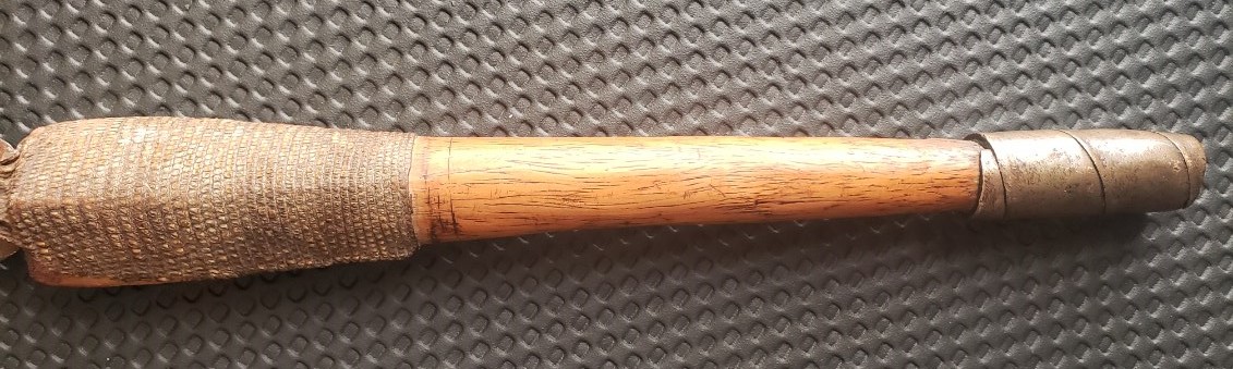 I stumbled on this interesting specimen unlike anything I have seen before. It has a very long curved blade that is tanged. The shaft/hilt has a monitor lizard skin sleeve on one end and a large brass coil on the butt end. Though unusual, southern Africa was the first area that came to mind for its place of origin. However, the Ngoni people migrated up into East Africa (Tanzania, Malawi, etc.) due to the Mfecane and influenced the weaponry and tactics of several of the people they encountered. The Hehe, Sangu, Ganda, and others were known to have adopted Ngoni weaponry including short stabbing spears. I wonder if this specimen might be an example of an adapted East African "Iklwa" or similar short spear. Any thoughts are appreciated (sorry for the poor lighting in the pictures). Spear length: 78.8 cm (~31 inches) - ADS |