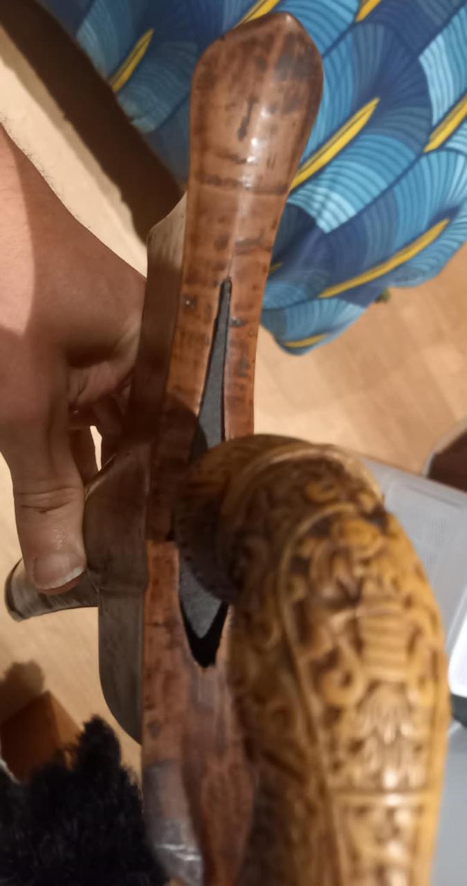 The wrongko is as well somewhat unusual for Madura, the lata is straight by the example in question, by the examples shown from me not. The hole in the pangulu handle isn't unusual, see the pics of one of my pangulu hilts. Regards, Detlef |