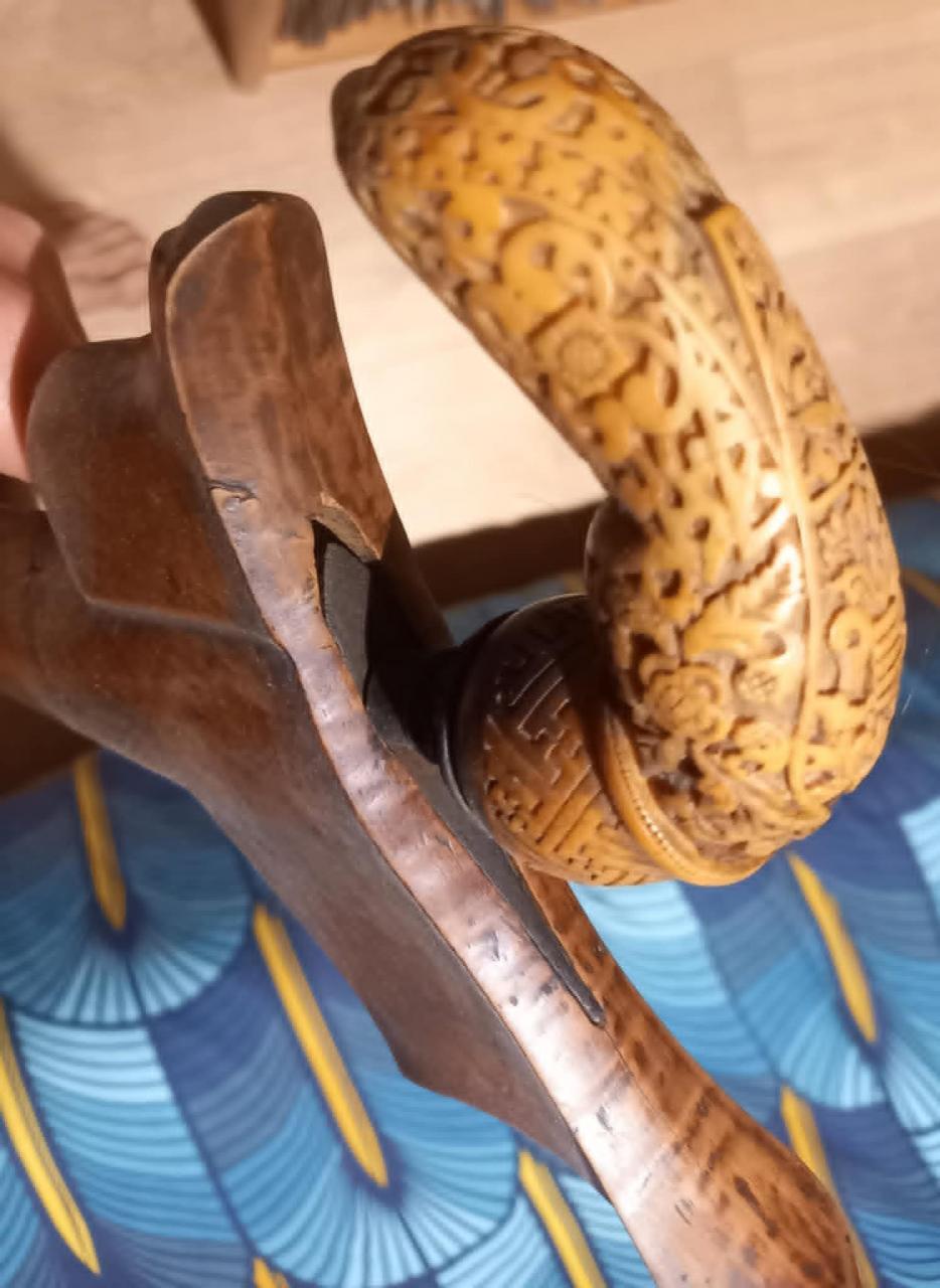 I have this Keris with a very nice ivory hilt, but I find the scabbard very unusual. I think the warangka isn't the original one because it seems to have been lengthened to fit the blade. The selut also seems more modern than the rest. I think it might be from Sumatra or Peninsular Malaysia, but I'd like to know if it's possible to have a more specific origin? |