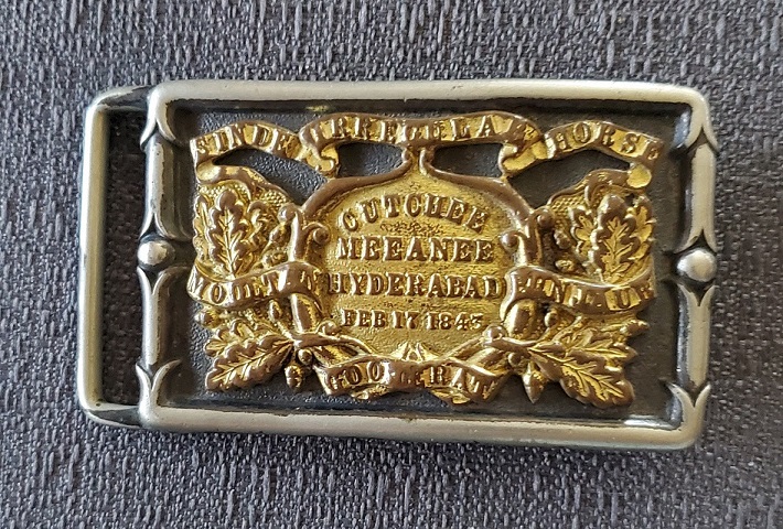 I had no idea John Jacob was involved in creating this interesting sword hilt design in British cavalry officers swords. The notion of pierced work in the sheet guards of these heavy cavalry officers swords seems to have begun with the M1796 period types, which I believe were termed 'honeysuckle' pattern. When the M1829 swords came out for both light and heavy cavalry, the M1821 swords both had the three bar design hilt for both troopers and officers. The 1829 heavy cavalry had the sheet bowl hilts, with the troopers plain and the officers with pierced designs in the guard which I thought were extension of the designs on the 1796. As these swords were of course produced until superceded in 1853 by the pattern of that year for ALL cavalry, light and heavy....it does seem quite possible that a design for the pierced work in the officers hilts might have been connected to John Jacob as noted. He was a brilliant officer of the East India Co. and very innovative as in the famed battle of Meeanee in Sind in 1843, he had used straight swords attached to rifle barrels and intro the 'sword bayonet'. After that campaign the remarkable pun supposedly issued by Sir Charles Napier...PECCAVI (Lat. -I have sinned) was issued noting his victory taking Sindh for the EIC. The sword pictured is the heavy cavalry officers of 1829, which continued until 1853. Jacob went into Sind in 1838 forming irregular cavalry unit as these were termed, comprised of native forces commanded by British officers. This is of course the standard pattern for the British regular cavalry, so the pattern design for the Jacob sword was likely following this type work but using the more native related theme as described. The Sind regions were of course highly influenced by Persia, so quite understandable. These men were keenly sensitive to the combining of tribal and ethnic forces and the cultural significance of many elements, so it would not be surprising that Jacob would propose designs using these kinds of themes. The belt plate is from later in 1850s recognizing the battle honors from Sind, and the Scinde Irregular Horse (Jacobs Horse) as cavalry were termed. Illustrated are John Jacob, and one of the Muslim Rissalders (NCO) of the Scinde Horse. |