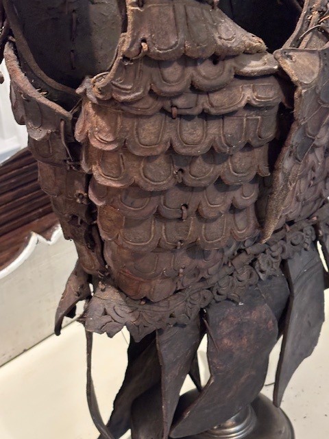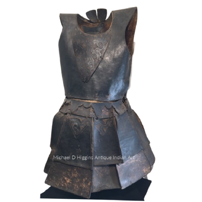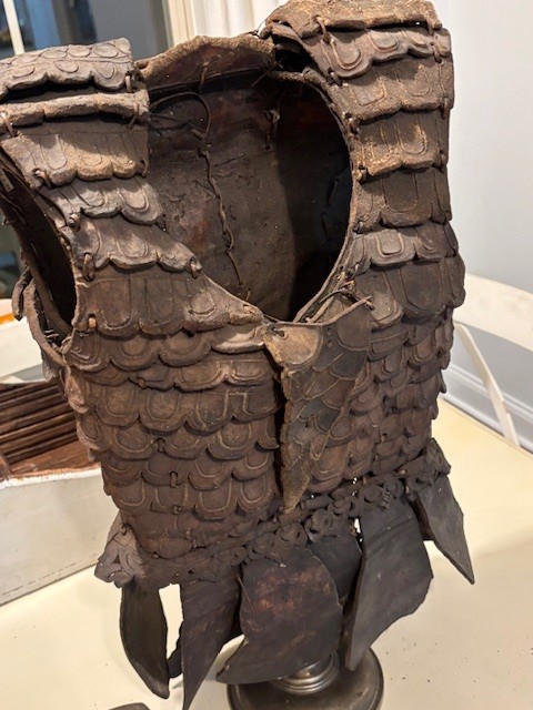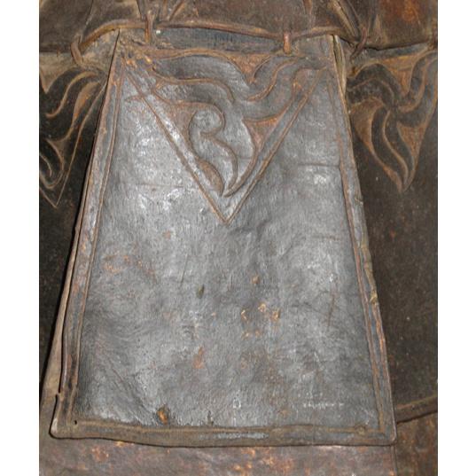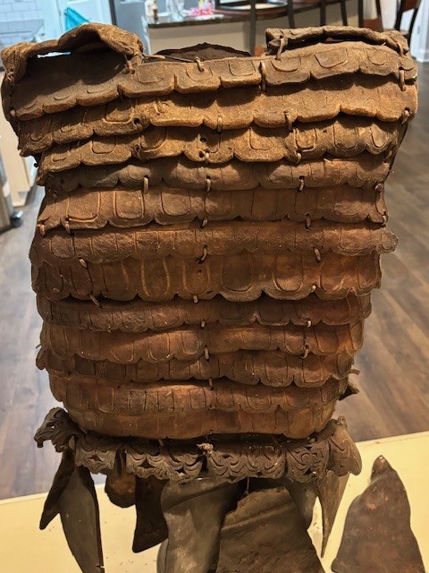 I am adding an example to continue the conversation. It is similar to the example you posted but also has noted differences. The differences I note is that the triangle decoration is an additional piece attached to the collar versus carved into the leather, the bindings are rattan, and it is layered leather. The similarities are that it opens at the side, it is a hardened leather and it has leather plates for the skirt. I can see the argument both ways. Is my example Spanish Colonial or an early Filipino armor based on the Spanish example? |