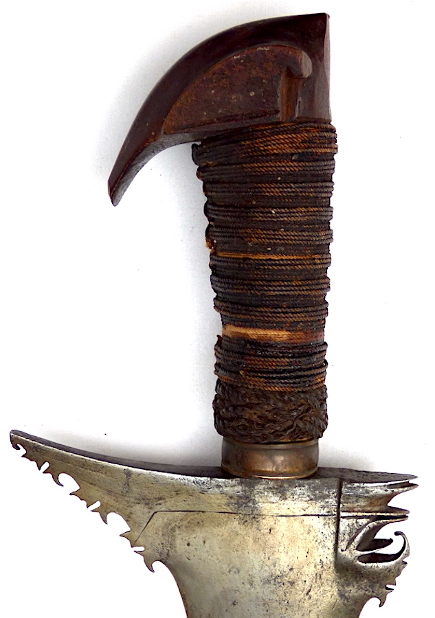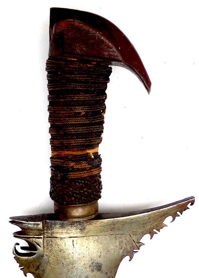 If the kakatua pommel were in its correct orientation and the two baca baca in place (strips for attaching the baca baca are still present beneath the wrap on the grip), I think this sword would have been dressed originally in a Sulu or a Brunei/Malaysian Borneo manner.