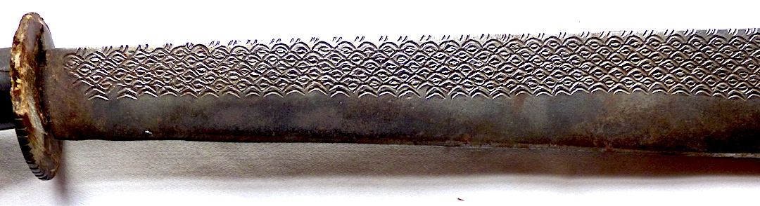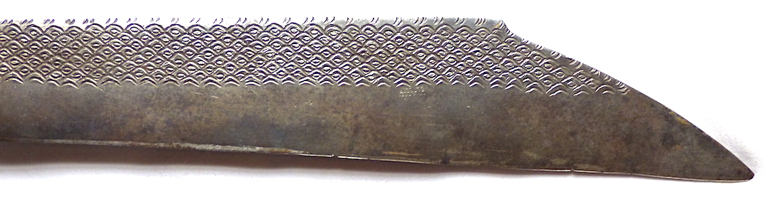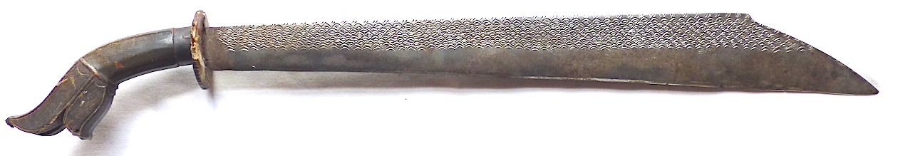 I'm interested to hear what our Indonesian experts think of this one and where it may be from. The blade has a shape reminiscent of a Moro kampilan, but much shorter. The back half of the blade adjacent to the spine on each side has repeating rows of semicircles containing "o" marks that look a little like eyes--perhaps "eyebrows and eyes" might be an adequate description for the basic motif. The bottom part of the blade on each side is smooth and has a dark patina. The width of the spine at the guard is approximately 5 mm, tapering to 2 mm before turning down to meet the tip.