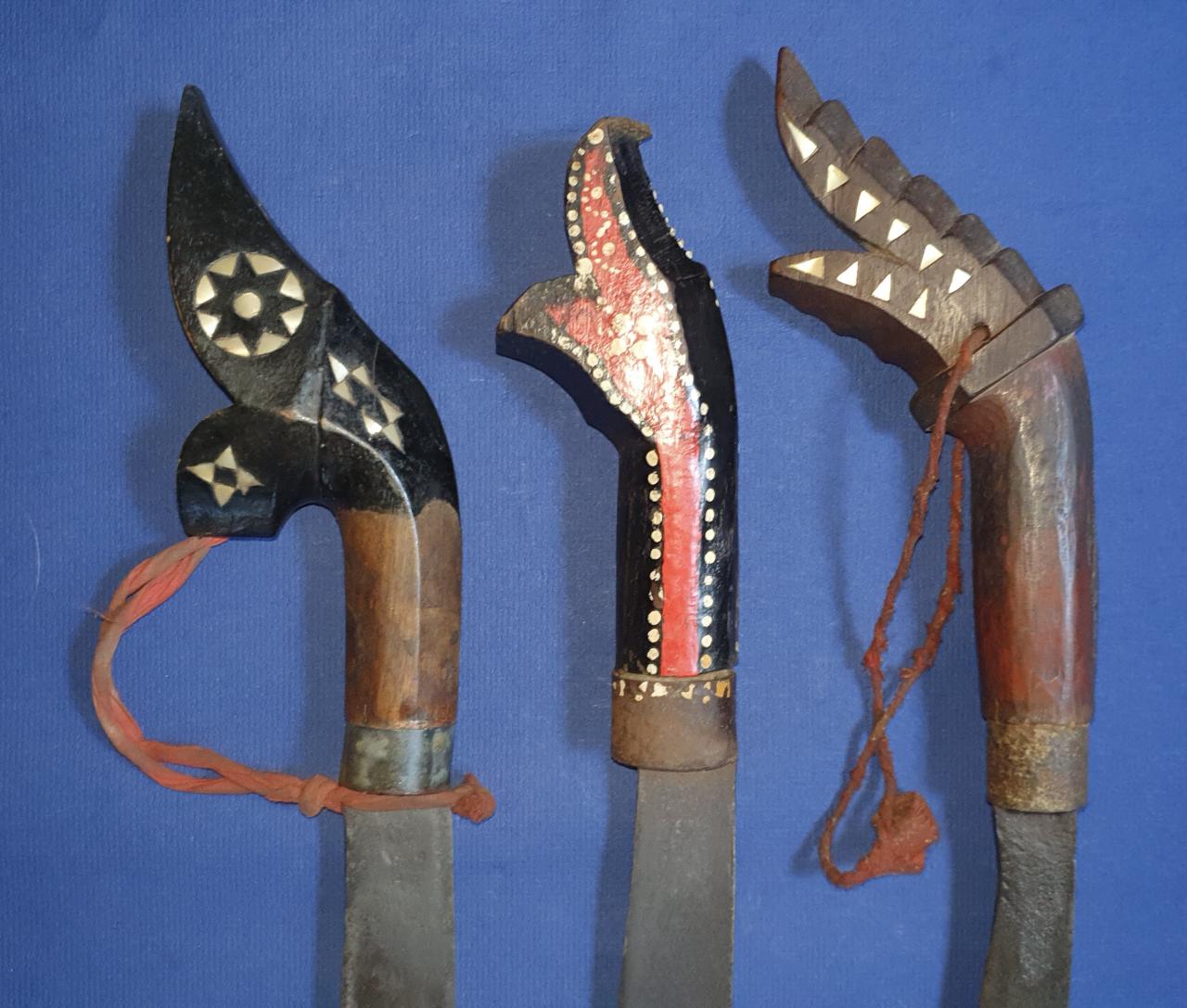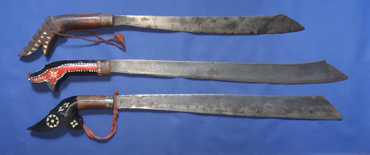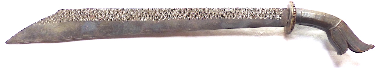 Thank you for your swift response. I do see considerable similarities. The blade presently has a sharpened edge, and the edge appears to show irregularities where nicks have been polished out. The blade decorations could fit with a ceremonial/dance function too. And yes, the hilt is probably horn. This example may have some age. Am I correct in recalling that your wife was from Halmahera? |