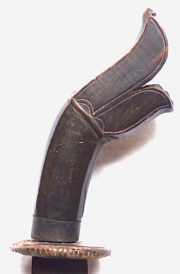 The guard is made of a supple leather disk with a "milled" edge. The hilt itself has a short grip, only 5 cm on the underside to accommodate the fingers (not nearly big enough for my large, 9.5 cm-wide American palm). Perhaps the sword was intended for a woman or a child. The hilt would be unusually small for an adult male. I'm unsure what to call the pommel (hulu). Perhaps it is an abstract makara but I'll leave that to others to identify what it may represent. OAL = 59 cm (23.25 in.) Blade = 47 cm (18.5 in.) Hilt = 12.7 cm (5 in.) . Last edited by Ian; 11th November 2025 at 11:11 AM. Reason: Spellig |
