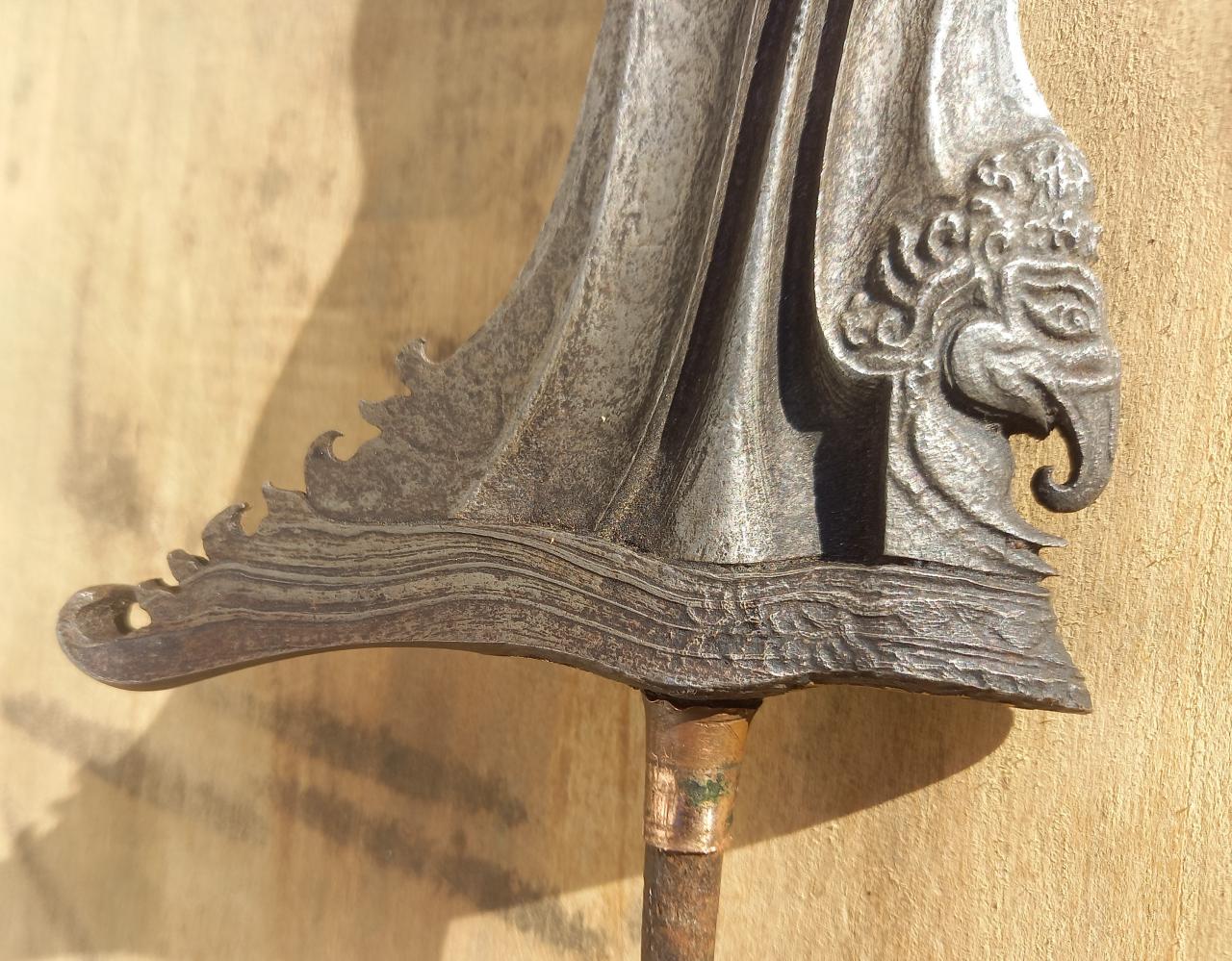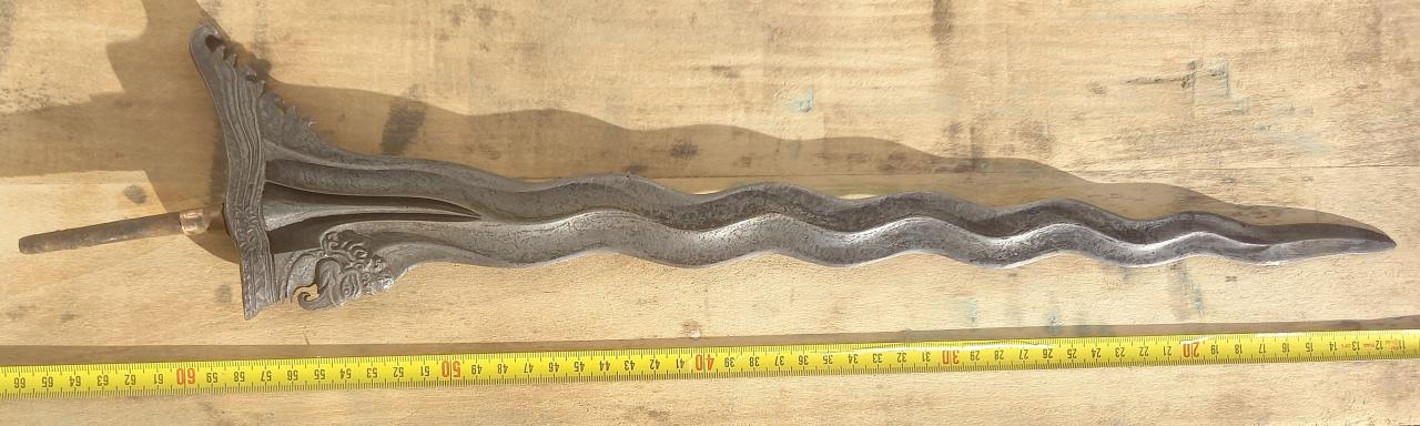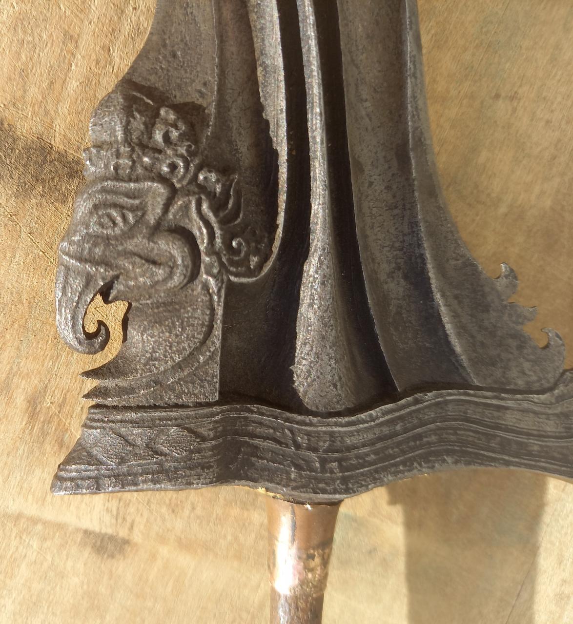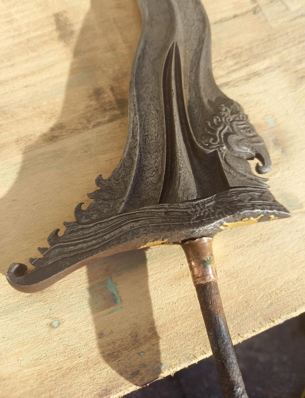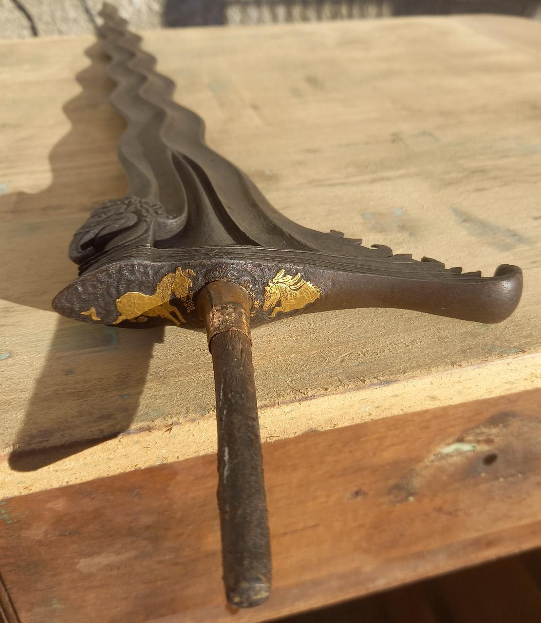 I'm reviving this thread because I finally managed to remove the handle using a heat gun. The blade is 46cm long. There are remnants of gold Kinatha on the top of the gonjo, but on the sides as well, you can see that originally there were lozenges, triangles, and plant motifs. I haven't been able to remove the base of the Palembang-style pendokok. The copper is very thin, glued with resin. The problem is that once the resin is hot and melted, the metal is so thin and flexible that you can't pull it off without crushing it against the Pesi, thus jamming it. The handle is well-proportioned for the blade, but I find its style more Javanese than Balinese (unlike the blade). |