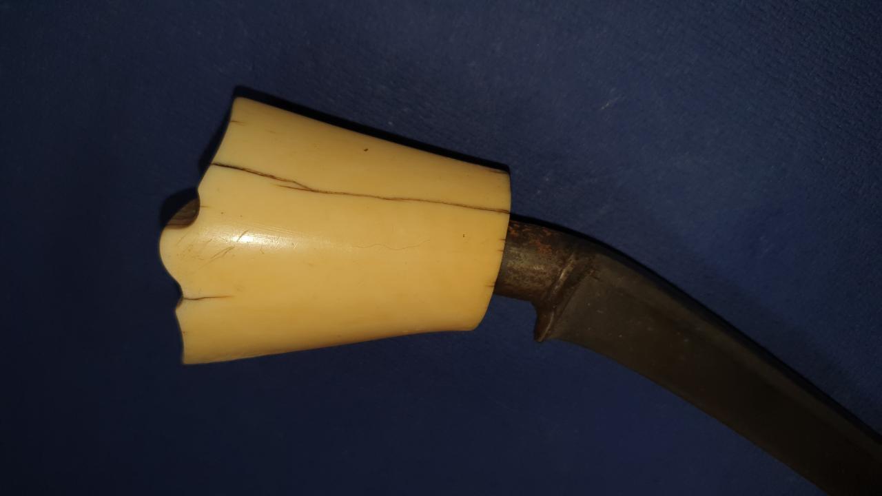In fact, the handle had already been completely broken in two (or even three pieces), then glued back together. And it might not have been the first time it had been glued in that spot, because on the side I can see an older repair with a small ivory nail to help hold the two glued parts together.