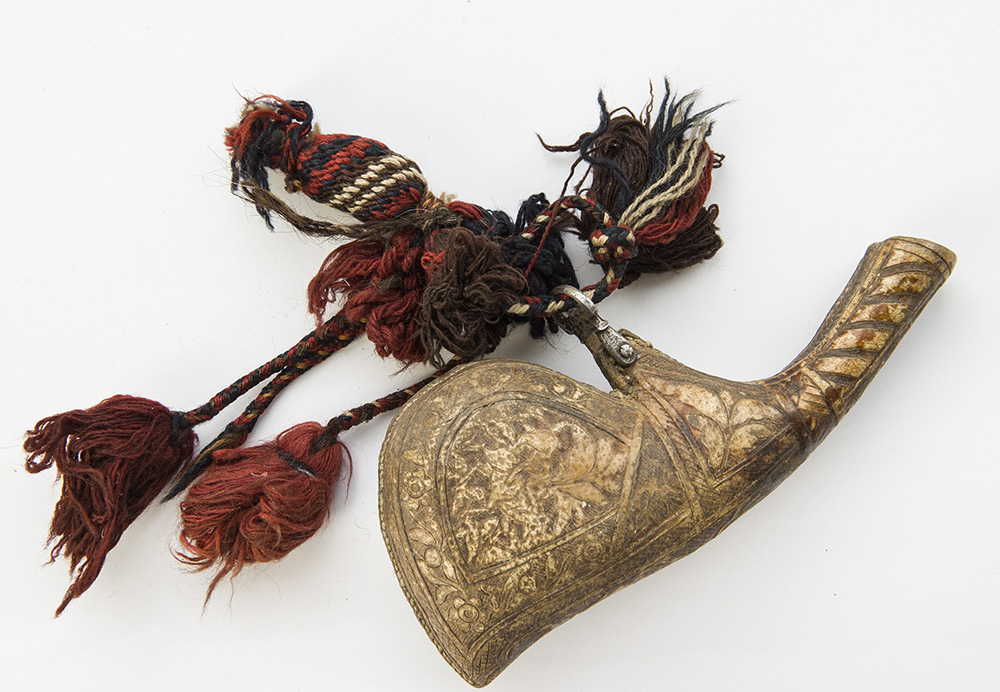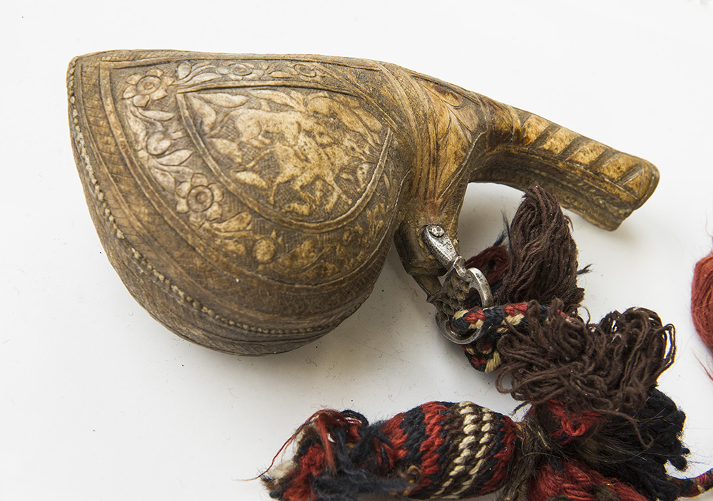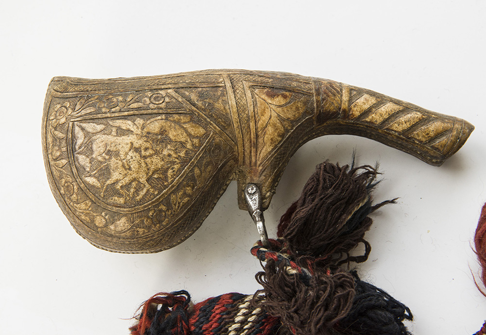 Tooled hide in a “camel scrotum” form. Hunting scenes on both sides. Fine fittings made of steel and wool. Nice patina. The plug/cap is missing.