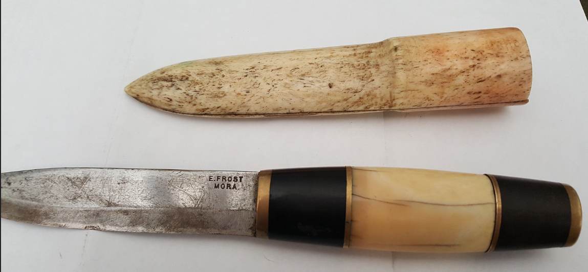The first picture is from a 1911 catalogue. I cannot tell if this is a drawing or an actual picture. This is where I noticed that an E. Frost could be on the right side as well. The second shows an E. Frost left side stamp. The later pictures of worn knives with the simple handles are from my collection. The first of these I have carried on and off for about 20 years and may be on its third sheath with me. The new one is Kydex and may outlast me. We will see. They are all either laminated steel or a single carbon steel. The laminated ones have a higher Rockwell rating but still seem east to sharpen meaning that there are not a lot of additives to add toughness and wear resistance to the steel. I threw in a KJ Erikson for good measure in a pattern that Frost made as well. The Mora smiths seemed to overlap a good bit.