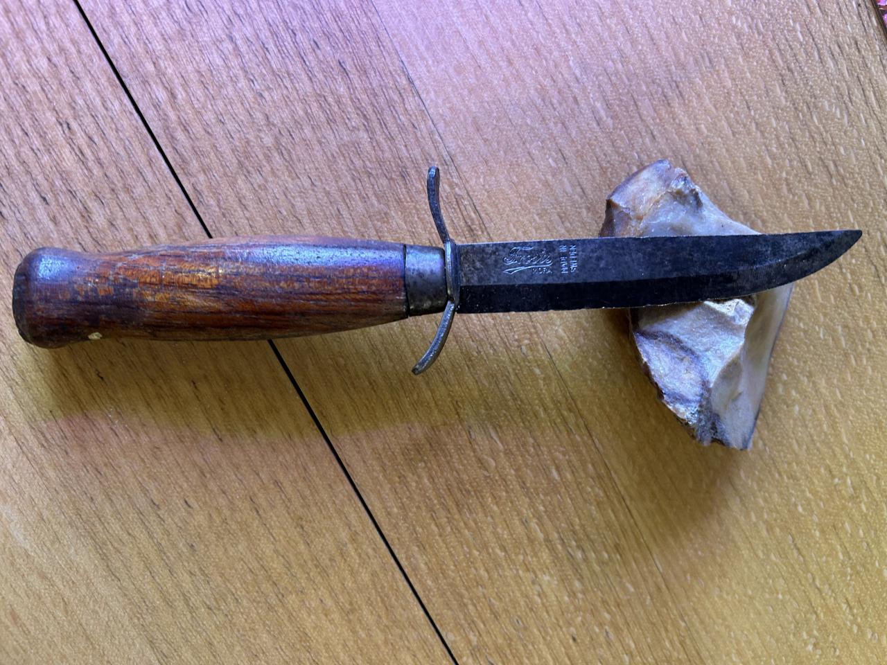 This and the recent puukko threads have opened up an interesting rabbit hole for me. It looked like a bad and worn stamp, but it made me think about all the Frost stamps I had seen and how to date them. I have not found a good timeline for the stamps yet but I have a theory that the E. Frost was first mark. Frost Erik Erikson lived from 1865-1924. The Frost brand lasted from 1891-2005 then merged with KJ Ericson to become Morakniv, The next mark is Eric Frost, and finally Frosts. The first mark I believe can be on the left or right of the blade. The Eric Frist mark is on the left side of the blade if you are holding it in normal grip. The Frosts mark is in the right side. The contemporary Morakniv mark is on the right as well. To throw wrench in this there may be Eric Frost knives made currently with the mark on the right. I found a source https://oldmora.blogspot.com/2021/11/Frost.html that I gleaned much of this information from. It appears that a pre 1930 knife should be a hand handmade in-house laminated steel, with all the metallurgical pluses and minuses these phrases imply. I.e. either much more to less durable than later blades even the laminated ones that were rolled and stamped. I would be curious to see if the pre-1930 knives possessed a distal taper. Interestingly there could be close to a billion of the various Frost knives floating around the world.