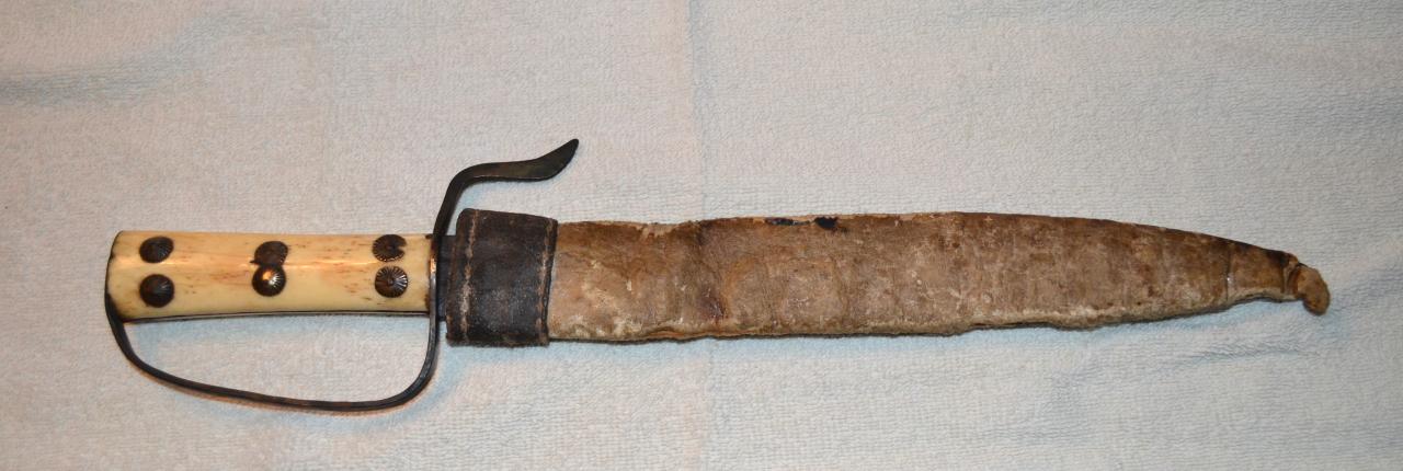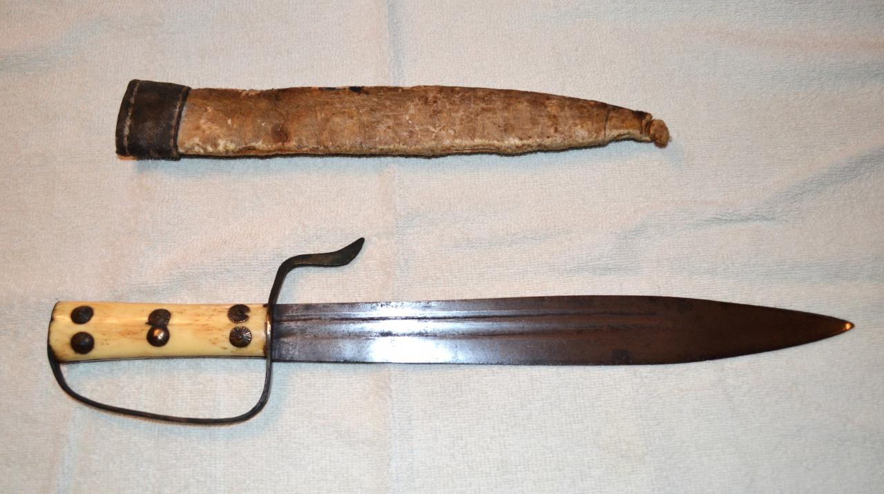 Might also be a Spanish colonial knife. That style of D-hilt is seen on some espada ancha. The blade could be from an old cut down sword.