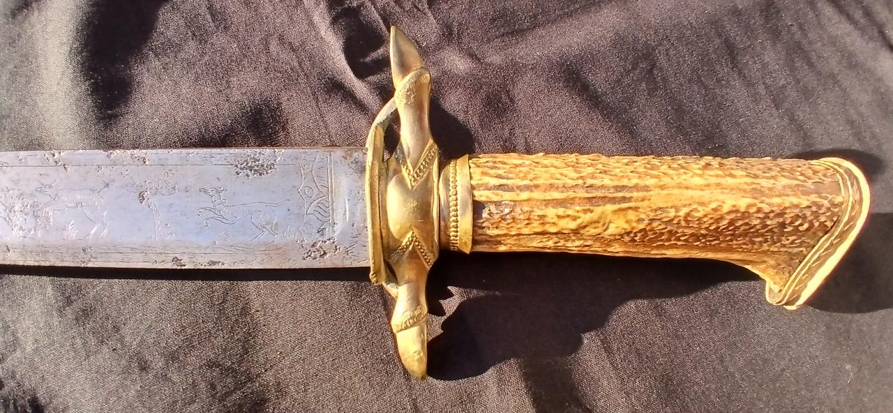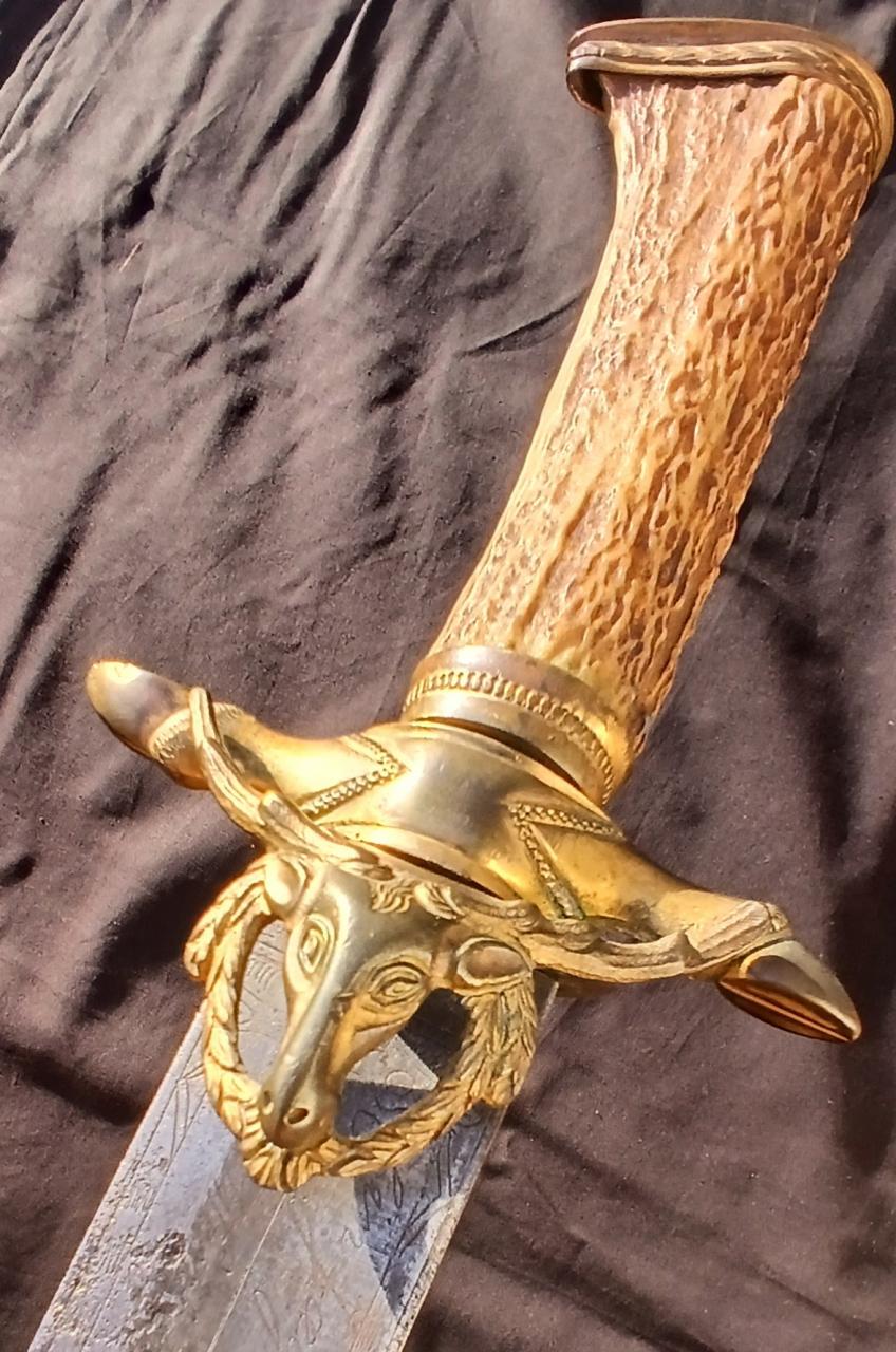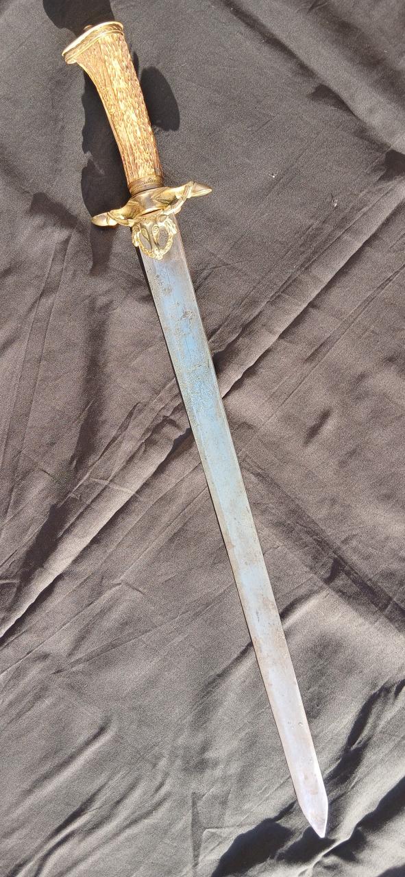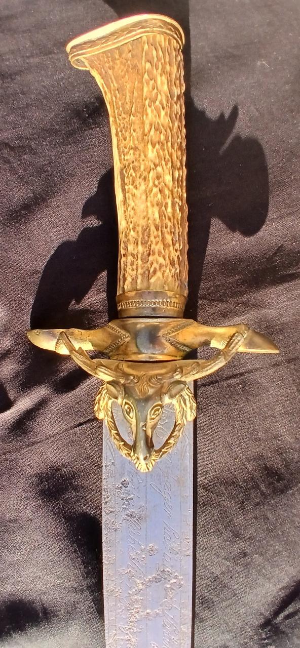 The grip is made of brass with rests of gilding.The shell is a sculptural stag head in a foliage garland.The ends of the guard are formed as stag hooves.The handle of the hunting sword is made from stag horn.The blade shows a epigram on one side : " Ein Jäger hat allzeit Verlangen mit wenig Mühe viel zu fangen " .It means that a hunter tries to catch a lot without effort.The other side of the blade shows a dog hunting an animal.The blade shows corrosion.The sword has a length of ca.75 cm and the blade has 4cm on the upper part.