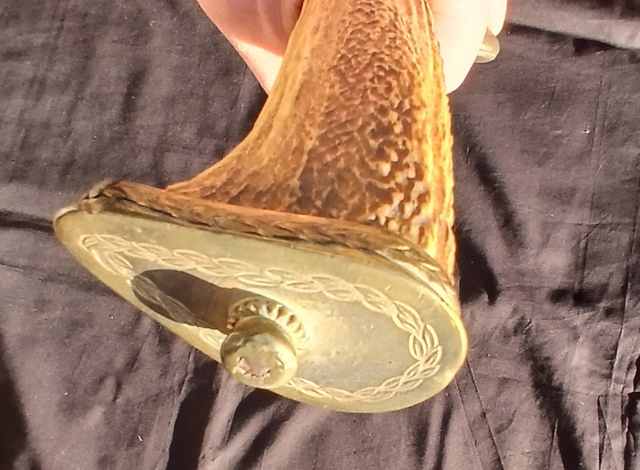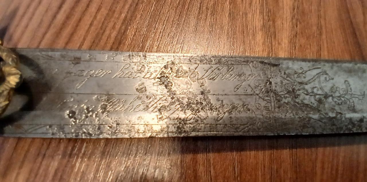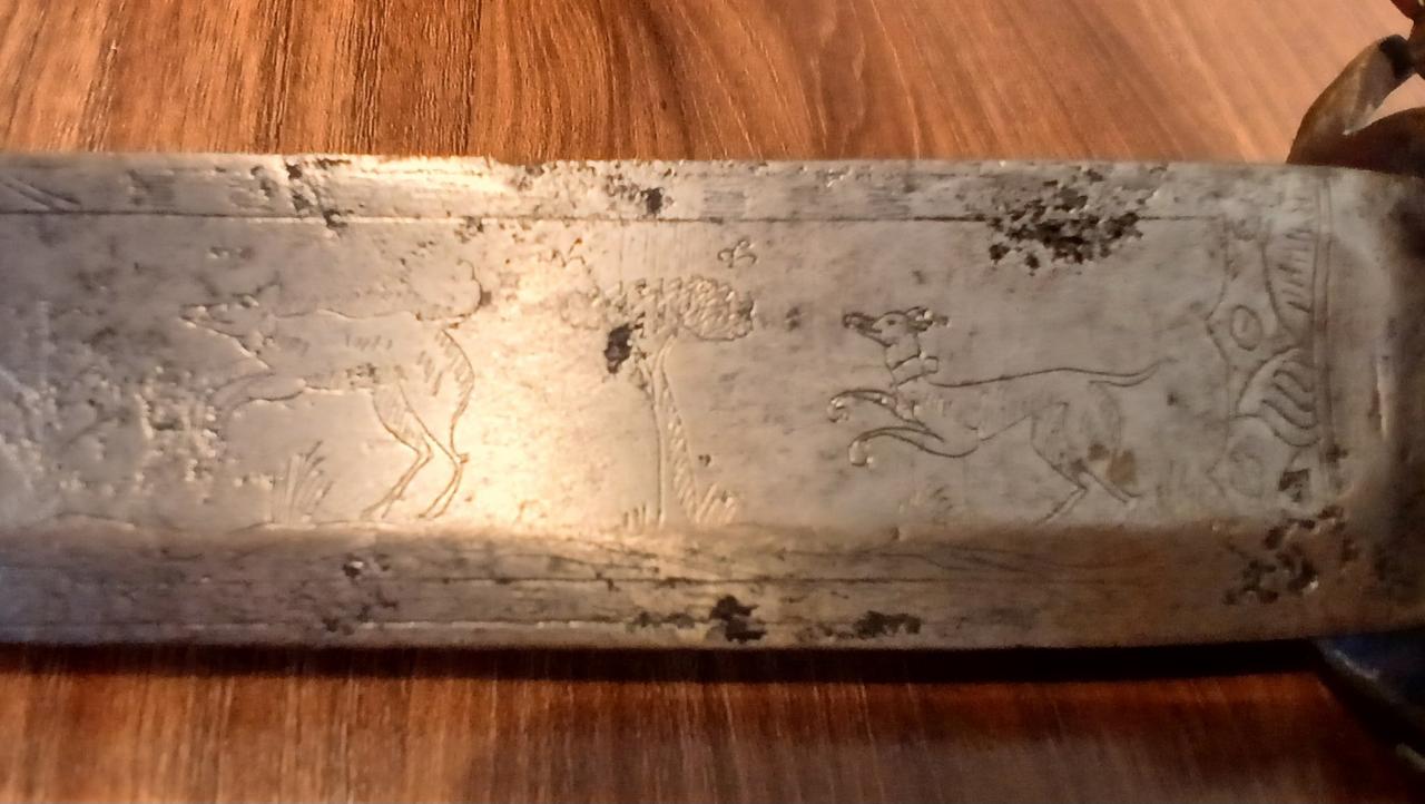 The grip is made of brass with rests of gilding.The shell is a sculptural stag head in a foliage garland.The ends of the guard are formed as stag hooves.The handle of the hunting sword is made from stag horn.The blade shows a epigram on one side : " Ein Jäger hat allzeit Verlangen mit wenig Mühe viel zu fangen " .It means that a hunter tries to catch a lot without effort.The other side of the blade shows a dog hunting an animal.The blade shows corrosion.The sword has a length of ca.75 cm and the blade has 4cm on the upper part.