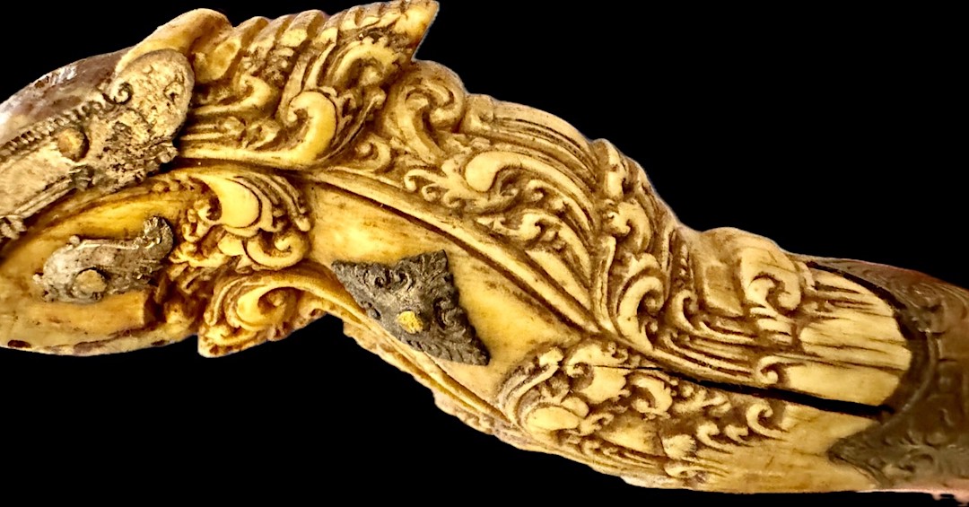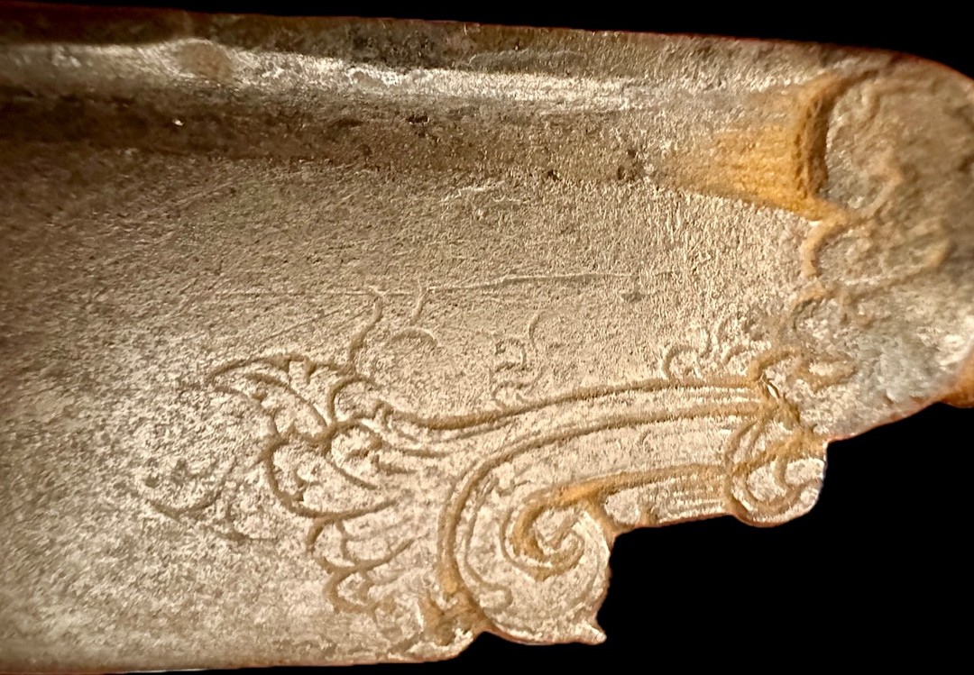 An overall view of the knife shows that it has a blade and hilt that are commonly found on piha kaetta. The old blade has been cleaned to reveal some old carved designs at forte, and there is widespread light pitting consistent with an 18th C knife (although it could be later). The hilt is of a recurved shape and was probably carved from elephant material. The end of the hilt is not visible to determine whether the tang is full length. Your ideas and opinions are very welcome. . |