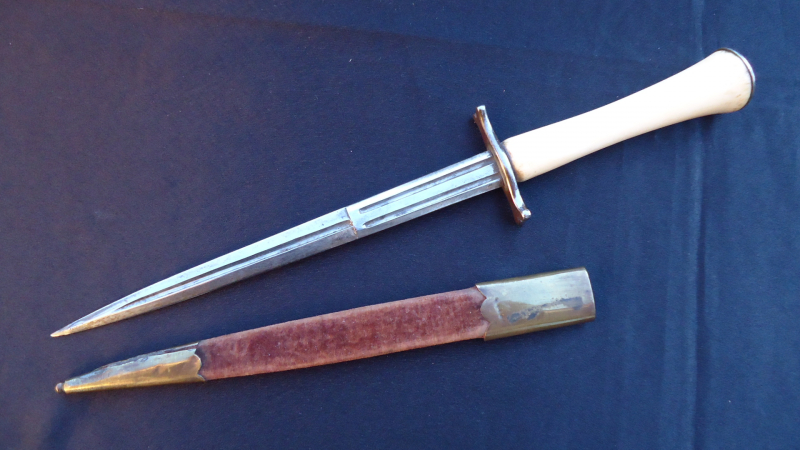 I think that the dagger could be a "coup de grace" dagger from a rich/important person from the mid. to end of the 19th century and the bone is maybe from a deer leg. I asked which bone it could be because the seller brought human bone in play but I personally think that this is most unlikely. I also don't think that it is a Freemason dagger, but this is a personal guess since I just don't know enough about this category of daggers.But it would be interesting to read what others think about this dagger!