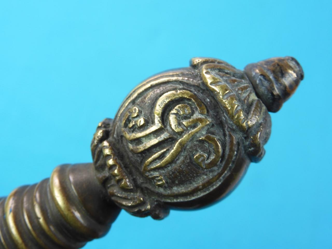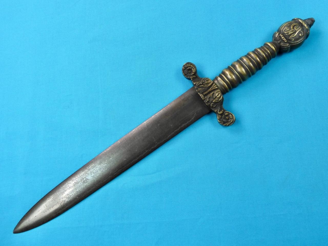 I received this dagger as my Christmas gift. It is 16.5 inches overall, with a 10.5 inch blade. Also, the blade is 1.25 inches wide. It has a nice weight to it, probably 1.5 pounds. Hilt is brass ribbed and what appears to be a "GR" cypher on the pommel. Could this be a cut down British bandsman sword, pre-pattern? My gut tells me that the age is around early 19th century. Thanks for any comments. |