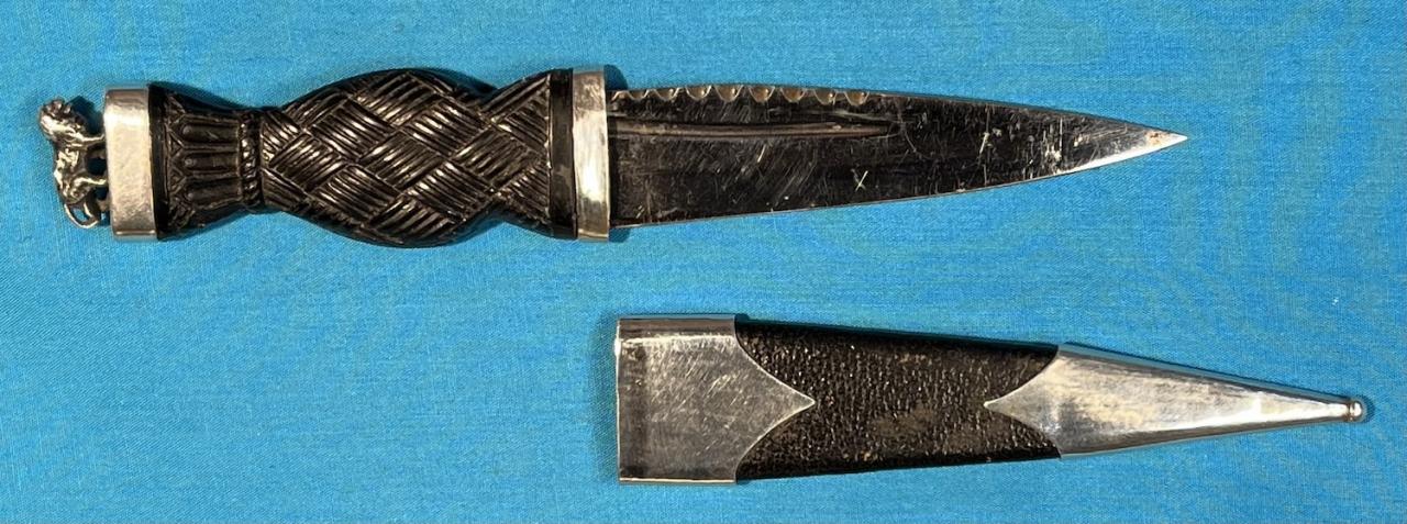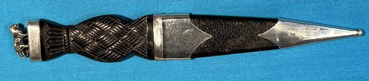 Up for sale is this sgian dubh. The mounts are sterling silver (including the silver lion on top) and the hilt is made of ebony wood. The scabbard is made of wood and leather. Blade is stainless steel. This piece has been restored and has been used but is in good condition. Silver hallmarks are ".925", sterling silver.
