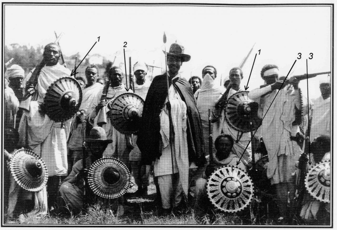 Another highly prestigious military figure below the Dejazmach was the so-called Fitawrari, who was also required to have a sturdy round shield decorated with metal (perhaps no longer with silver?; but the decoration on his shield was reportedly considered a necessity).