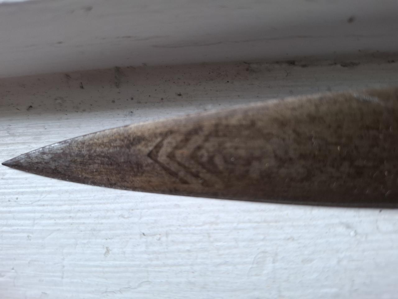 This dagger has been made out of a cut down, probably, British officers infantry sword. The 'Star of David' is in actual fact two triangles meant to represent strength re the swordsmithing process. Difficult to give you a time scale but at a guess late 19thC to early 20thC. The pattern down the blade is a further clue to the lineage of the dagger as most British Officers swords had some sort of decoration on the upper part of the blade. Regards, Norman. |