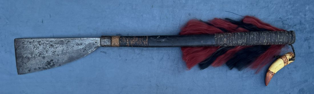 THE DESIGN ON THE BLADE OF THE CURVED KNIFE DOSEN'T LOOK NAGA TO ME OTHER THAN THAT I CAN'T SAY, PERHAPS SOMEONE WILL RECOGNIZE IT. THE CARVED FACE ON THE DAO HANDLE IS SOMETHING I HAVE NOT SEEN ON NAGA ITEMS BEFORE BUT IS A DECORATION CONSISTANT WITH HEADHUNTING SOCIETYS (I LIKE IT). WE CAN ONLY GUESS IF IT WAS CARVED AND PERSONALIZED BY THE OWNER OR ADDED TO MAKE THE ITEM EASIER TO SELL. THE HEAD EITHER REPRESENTS A ANCESTOR OR A FRESHLY TAKEN HEAD. IF IT WERE A SKULL THE EYES WOULD NO DOUBT BE ROUND. HEADS OFTEN ARE REPRESENTED IN THE ART OF TRIBES THAT PRACTICED HEADHUNTING BUT THE DESIGN WAS NO DOUBT RESTRICTED BY TRIBAL TRADITIONS AND TABOOS AS TO WHERE AND WHEN IT COULD BE USED. IN MORE RECENT TIMES THE TRIBAL LIFE AND ITS TABOOS AND TRADITIONS HAVE NO DOUBT CHANGED ESPECIALLY NOW THAT HEADHUNTING IS NO LONGER PRACTICED. I HAVE OFTEN WONDERED ABOUT THE FANCY HAIRY NAGA SPEARS. THE HAIR NEAR THE POINT WOULD SERVE TO KEEP BLOOD FROM MAKING THE ENTIRE SHAFT SLICK. THE OTHER SECTION LIMITS THE GRIP AND MAKES IT SUITABLE FOR A SHORT THRUSTING SPEAR FUNCTIONING LIKE THE ZULU SPEAR. SLIDEING TECKNIQUES AS USED IN CHINESE AND OTHER SPEAR FIGHTING TECKNIQUES WOULD BE ELIMINATED. THE HAIR WOULD ALSO MAKE IT A VERY POOR THROWING SPEAR. PERHAPS THERE ARE FILMS OF THE NAGA STYLE OF SPEAR FIGHTING TECKNIQUES.? THE SHORT SPEAR WITH THE BAMBOO HANDLE AND THE SPEAR WITH ONLY HAIR NEAR THE BLADE AND THE STEEL BUTT SPIKE COULD BE USED MORE FREELY. THE USE, TRIM AND COLORS OF THE HAIR DOES MAKE THE NAGA SPEAR ONE OF THE MOST BEAUTIFUL OF SPEARS.