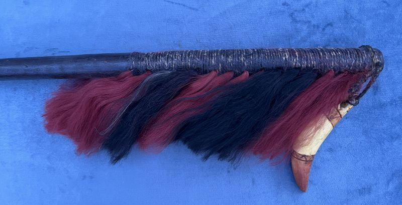 . What is the cap on the butt made of? To me the leather wrap looks like an addition to cover up the holes in the in the wood that once had hair tassles glued in. The horn thing made of? also a latter addition? not native? If it were mine I would probably remove the additions. Then you have a nice original piece just lost the hair which is common.