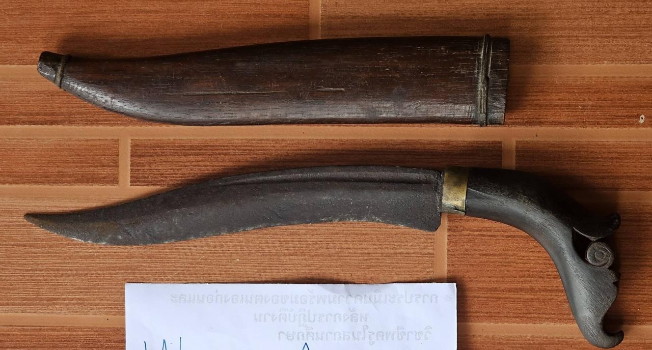 I never before have seen a similar handle style, short of this the knife in the picture in #13 pop up with a few other blades by a German auction, I won this auction but the small auction house wanted for shipping inside Germany 110,- Euro (!!) I wasn't willing to pay so I never paid the bill and I never got the lot. Finally I received yesterday from a good friend of mine an email with the knife shown in #12. This knife was sold by a Thai collector on a local collectors market. My friend contacted this Thai man and asked about my knife, the answer I have posted, nothing more. I am far away from accepting the given origin but I have given his answer for discussion as another possible origin. This Thai man stated also: "the blade comes in various shapes" and in laminated steel and as well in non-laminated steel.