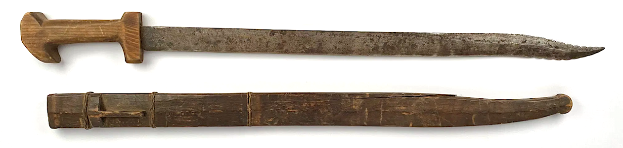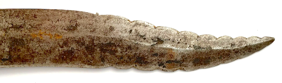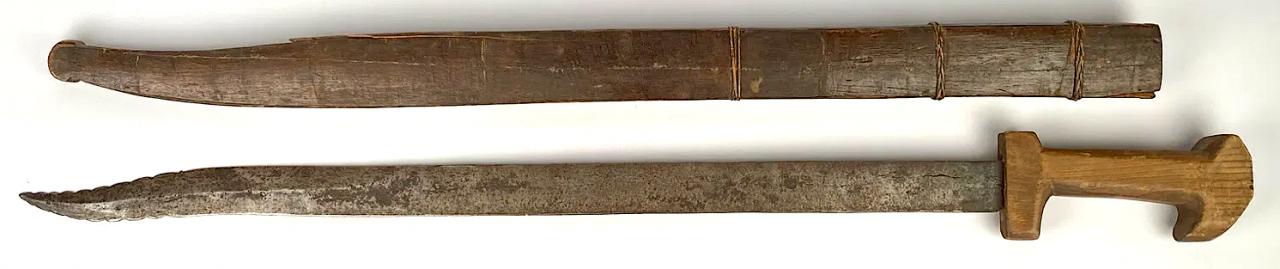 This is a distinctly Filipino sword in its original scabbard. The blade profile has a distal recurved blade that might have been somewhat copied from the 1880 Spanish Artillery sword shown above. The edges of the recurved section are sharp and serrated.