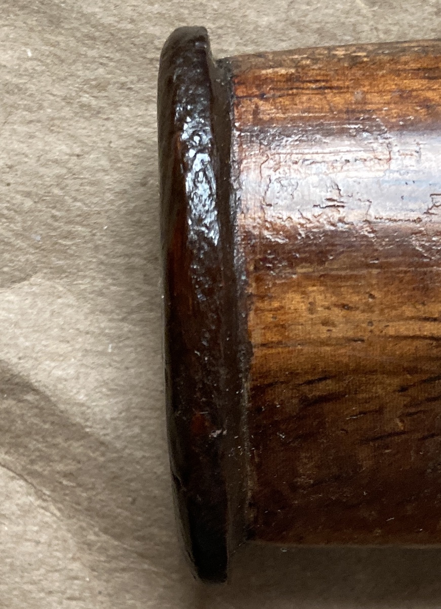 The buntut has been covered with a rather opaque stain. I have examined the chip with a magnifying glass and it appears for all the world to be some sort of poplar. The bottom of the buntut (where the stain is less opaque) shows a figure like poplar also. Ideally, I would like to fit a wood piece to fill the chip but that looks like it might be tough to do. I’ll give it a shot but, if I fail, plastic wood will work.