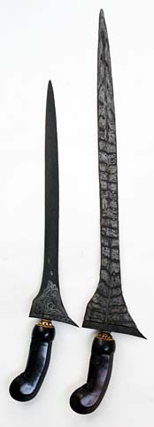 Dhapur "Brojol" with pamor "tunggak semi" (sprouting bud), and dhapur "tilamupih" with pamor "kupu tarung" (fighting butterfly). Both with Yogyanese hilts...