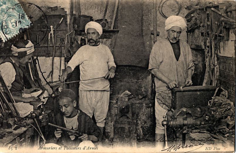 Have a look to this postcard circa 1900 in Oran. As for the process, manufacturing was organised in 5 guilds in Tetouan (idem elsewhere) barrels (dja' ibi) from imported iron or bronze. locks (znaidi) stocks assembly decoration The parts circulated from the souks of the smiths & cabinet makers to end in the souk of the jewelers, as Marrakesh even today has. Louis-Pierre |