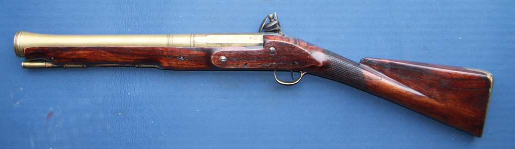 be viewed with a large degree of scepticism, due to the significant boost to its value granted by an authentic association. I am afraid that I don't think that the Mail related script on this piece is remotely genuine, being quite wrong stylistically and not particularly well executed. The highly respected London gunmaker H. W. Mortimer was an early contractor supplying arms for guards on Royal Mail Coaches circa 1783. An example garniture of arms supplied by Mortimer can be viewed at the National Postal Museum. Mortimer was a top quality gunmaker, and this is reflected in the standard of the guns he supplied to the Crown, the better to withstand the rigours of the Coaching service. I don't feel that this blunderbuss exhibits the high standards of manufacture that would be expected in a Government contract piece. The better quality English makers from this period were justifiably proud of their workmanship and took pains to carefully mark their products, and clear British proofs would be present too. Perhaps removing the lock and barrel from the stock as suggested in an earlier post will shed some light on this gun's origins. Whilst the general appearance suggests an English blunderbuss dating from the 1780s, I'm a little concerned about the the signs of artificial ageing on the handrail stock and what looks like cold blue wash on the lockplate. It's an uncomfortable fact that blunderbusses because of their value and popularity are frequently spuriously marked and faked. I hope that this has not disheartened you too much, but if you paid a premium for this gun as a genuine Royal Mail piece you have good grounds for the return of your money if it was auction or dealer purchased. Best regards,Simon. |