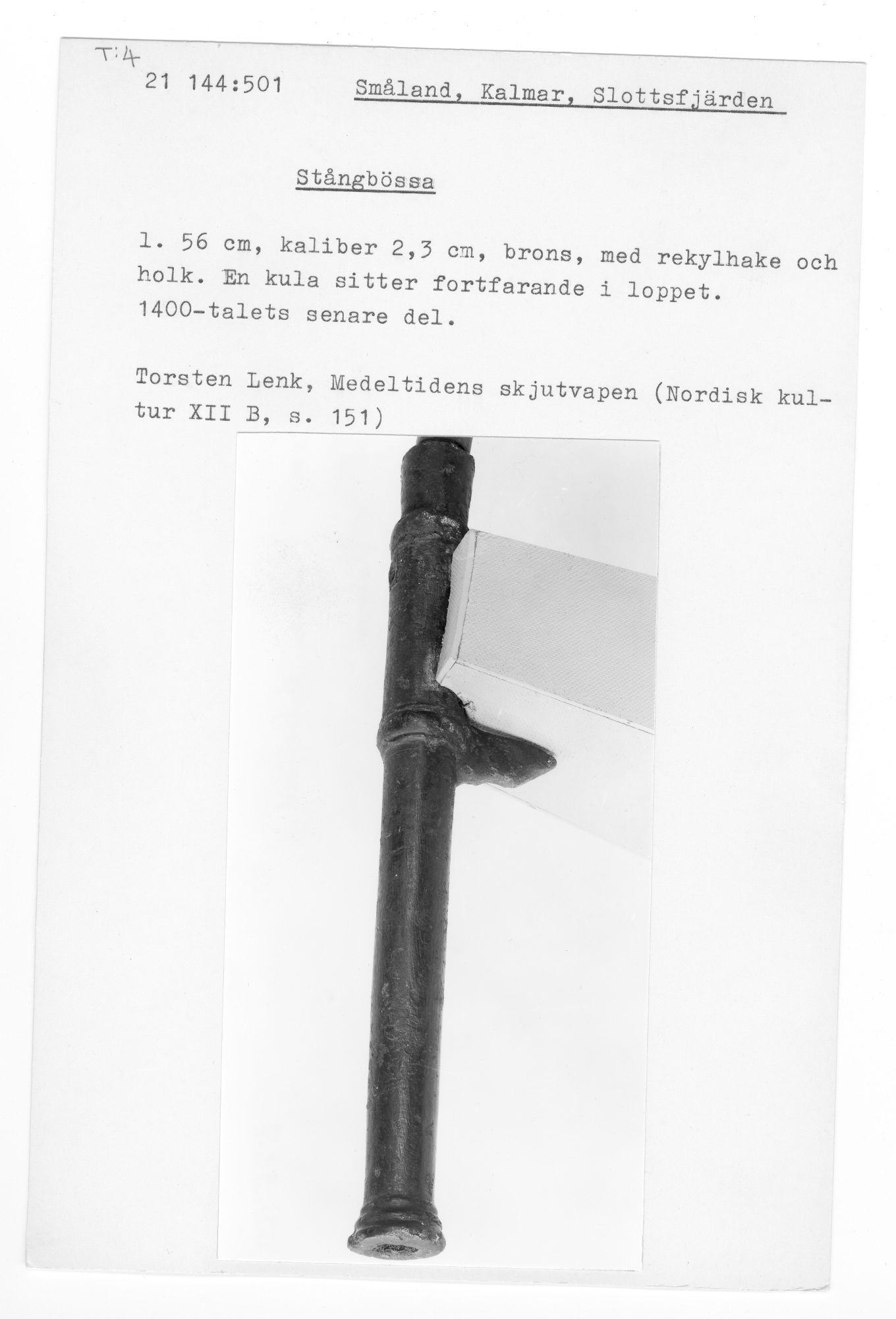 Found in Stockholm, dated to the late middle ages. Barrel 106 cm, calibre not mentioned.