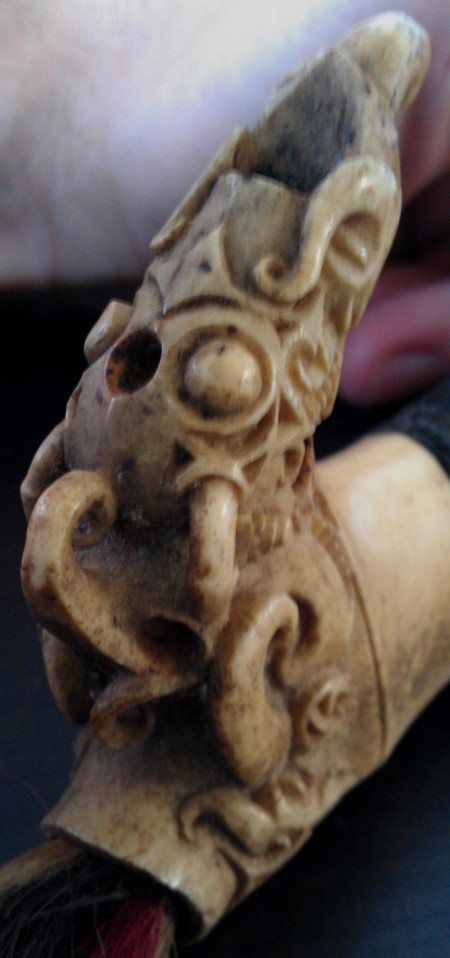 The top hilt is unusal. Is it newer or just rare? Does the rest of the mandau also carry unusual features? Maurice, thatīs a mean looking hilt figure Michael |
