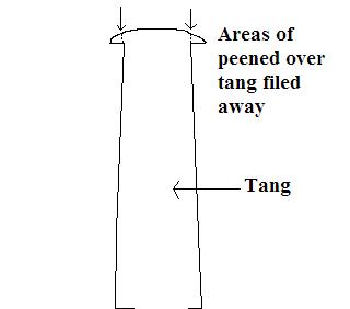 I'm sorry my explanation wasn't very accurate. The end of the tang is not filed off, just the sides of the 'mushroom' created when the tang was originally peened over. See my very basic drawing. Ian Last edited by Ian Knight; 28th January 2010 at 09:08 AM. |