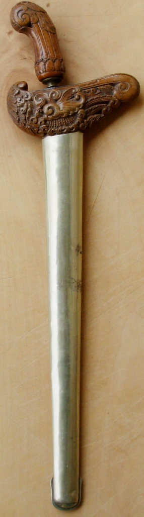 Hello chregu, yes it's a Madura keris and the sheat form is called jurigan or gambilihan like Rick write. Keris like this have been discussed already some times here, search for, you will get some more informations. It's good possible that the keris older then from the 50's. Would be nice to see the blade with a fresh warangan again. Here a very similar keris from my collection. Detlef |