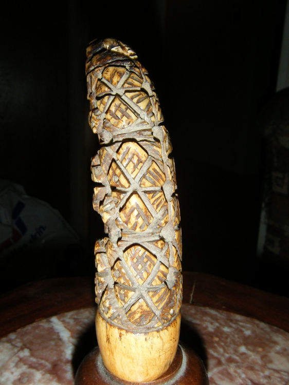 I've had this reason given to me a number of times by a number carvers. So --- just maybe, at some unknown time in the past, a carver with imagination had the tip of a horn, and asked himself what he could create from it. When we are dealing with art forms from a time and place that differs from our own, we need to be able to think in a way that also differs from 21st. century rational. As 21st century rational thinkers we would identify the need, thus reason, and seek the material. People who think differently could have the material, and then seek the use, thus need, which provides reason. |