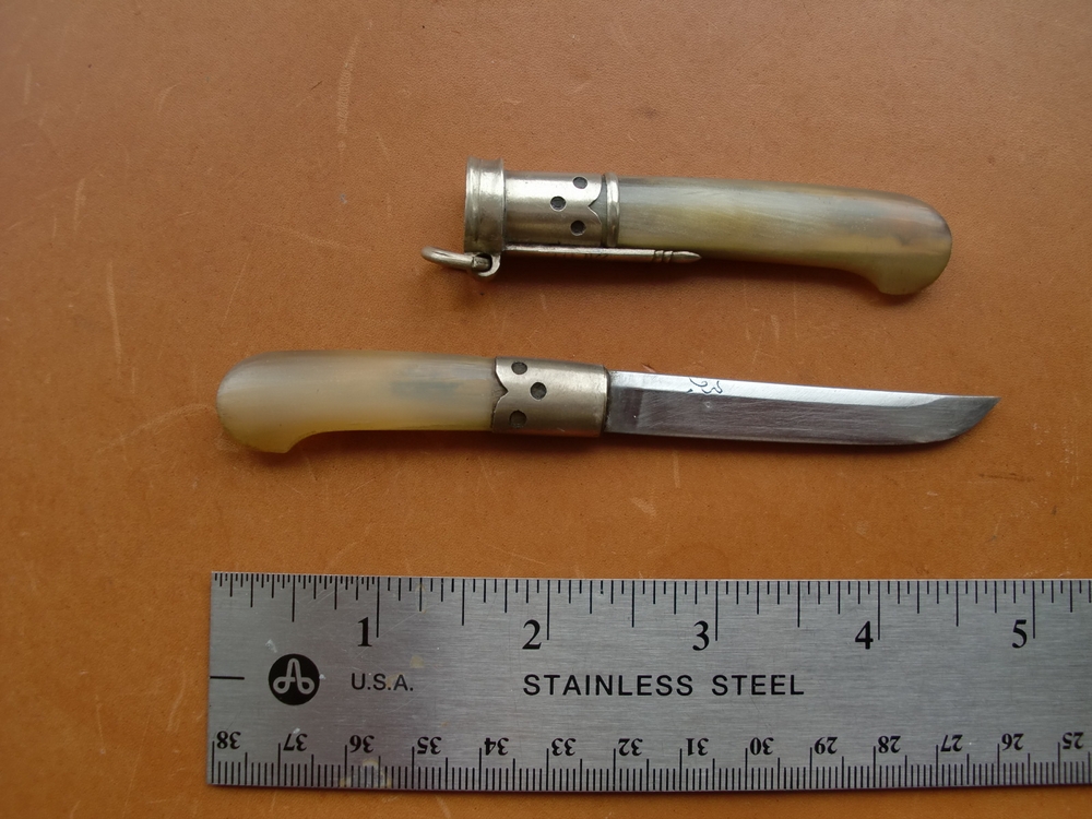 thank you for sharing the pictures of your nice example as well the further informations. Here one which was sold recently by ebay but I believe that this one is not very old but a nice looking one with a similar mark at the blade. Grip and scabbard from white horn. Regards, Detlef |