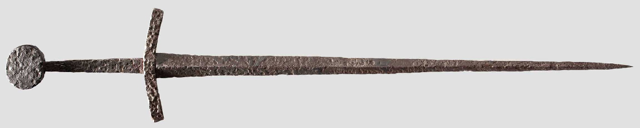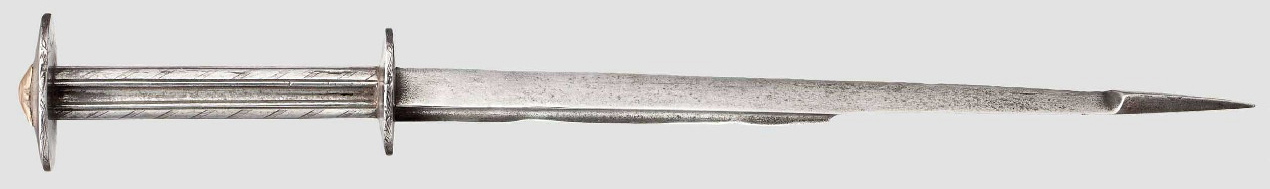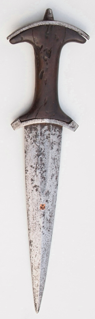 A short history and description of different dagger types. Medieval daggers are somewhat neglected in the weapons literature, perhaps because they have an assasin' s image and nearly all Museum examples are of poor condition, and not much research was done about this subject since the publishing of Bashford Deans 'Catalogue of European Daggers' in 1929. An exception in the contemporary literature is the book of Hugo Schneider, Waffen im Schweizerischen Landesmuseum, published in 1980. This book contains many medieval daggers, some of them datable, based on their find circumstances. However, all are in excavated condition. Therefore I want to bring to light some good examples in not excavated condition, sold at auction in the last years, or from Museums and private collections. I want to start with a short history of the dagger, which is one of the earliest weapons after the club and the spear. The dagger developed from the spear by adding a grip to a spear blade. First made of horn or bone, than of flintstone, finally of copper, bronze and iron. During the copper period the blade length of the dagger increased, finally the sword was developed from the dagger, and superseded it as a warriors weapon. After the migration period the dagger was replaced more and more by the short Sax in Central Europe, which itself came out of use during the tenth century. The following ab. three centuries, the dagger was not found amoung the weapons of a knight. The reasons for these changes is unknown. In the second half of the 13th century, the dagger appeared again, developed from the knife, which was used through all times. These daggers therefore had a single edged blade, usable for cutting and stabbing. With the development of better armour, cutting with a dagger was useless, and a blade section better suitable for stabbing was needed. Therefore the triangular section of the single edged blades were reinforced and often a back edge was added. Also a new blade section appeared. The new daggers had blades of flat diamond or roof-shaped section, broad at the hilt and acutely tapering. Later examples may have a square or complex section. Two main types of daggers were developed. The first type had a blade with a tang. The short guard, the grip and a pommel were added and fixed by riveting the tang, according to sword hilts. In early or simple examples the hilt and grip are made completely of wood, without metal parts. I call it Type I Different sub types can be discriminated. Type 1a It resembles closely the shape of a sword, only smaller, but some examples have single edged blades. It was in use during the 14th and first half of the 15th century. Type 1b It has a pommel in the form of an antenna or a circular ring. It was in use during the second half of the 14th and early 15th century. Type 1c It has a grip thickened at the guard like ballocks, the pommel is often only a simple cap on the grip. Sometimes the hilt and grip are made of wood without metal parts.It is called ballock dagger and was widely used all over Europe during the 13th -16th century. Type 1d It has horizontally assembled circular or polygonal disks as guard and pommel. It is therefore called rondel dagger and was used all over Europe in the 14th, 15th, and early 16th century. Type 1e It has only a rudimentary guard, the pommel is formed of two large disks assembled in the form of ears. It is therefor called ear dagger. It was mainly used in Spain an Italy in the second half of the 14th and first half of the 16th century. A few examples may date earlier. Type 1f It has a sort bar as guard and pommel, both curved towards the blade. Most often the guard has reinforced and elevated ends. The blade is very broad at the hilt and of strong flattened diamond section, strongly tapering to the tip. Some blades have a roof shaped section, one side is quite flat, like a diamond section blade, cut in halves. The blade has most often a short fuller on its upper third. This type is most often, but wrongly called 'Schweizerdolch'. What we call today Switzerland was a part of the German Empire in the 13th and 14th century. The type was used all around today South Germany, Austria and Switzerland. Not even Hugo Schneider, the author of the book 'Der Schweizerdolch', called it like this. It is also often dated to the second half of the 15th and first half of the 16th century, which is clearly too late. The type was used during the second half of the 13th and the whole 14th century. Type 1g It is very similar in shape to type 1f, the only difference is that ths guard is curved towards the grip, not towards the blade, and the blade is less broad at the hilt. It was in use during the 14th, 15th and 16th century. The later examples called with right by Hugo Sschneider as 'Schweizerdolch', the earlier examples widely used in Germany and surely originating there. In earlier examples the hilt could be made completely of wood. Type II The second type of dagger, called Baselard, has a blade with guard, tang and pommel forged in one piece. The guard and pommel are most often forged at right angles to the tang, but also different shapes were usual. The sandwich grip is made of horn or wood and is always fixed onto the tang, guard and pommel with rivets. The blade section is most often of flattened diamond section, but also single edged blades were used. Although the name Baselard points to the town of Basel, it is very unlikely that it derived from there. The type was used in today Italy,Switzerland, Austria, Bohemia and Germany during the 13th , 14th and early 15th century. |