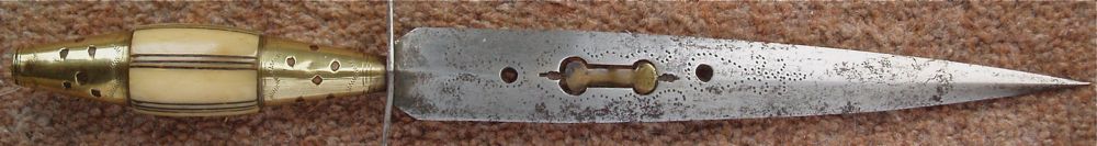 Thanks for coming in on this, trawling the past threads I did note you had a certain penchant for these daggers. As far as the voids and inserts go I can only see a decorative element to these, far too far up the blade for 'poison' and why would you want to put poison on them anyway the blade profile is excellent as it is for thrusting to a depth that would be meaningful. My blade does not have a proper edge for 8.5 cms from the point and then it is perfectly sharp up to the point where it cuts in under the guard. Rather than a reinforced point per se I would surmise material has not been removed by sharpening that section thereby leaving it more robust for the obvious reasons, makes sense? I think these knives are meant to be both decorative and designed to be used much like the S.American Criollo (gaucho) knives. I really like the earlier one you have, quite a menacing beast. Thanks again for your interest.My Regards, Norman. P.S. It would be interesting if those members who have one/some of these daggers to check out if theirs has an unsharpened point and to what extent up the blade it remains so. |