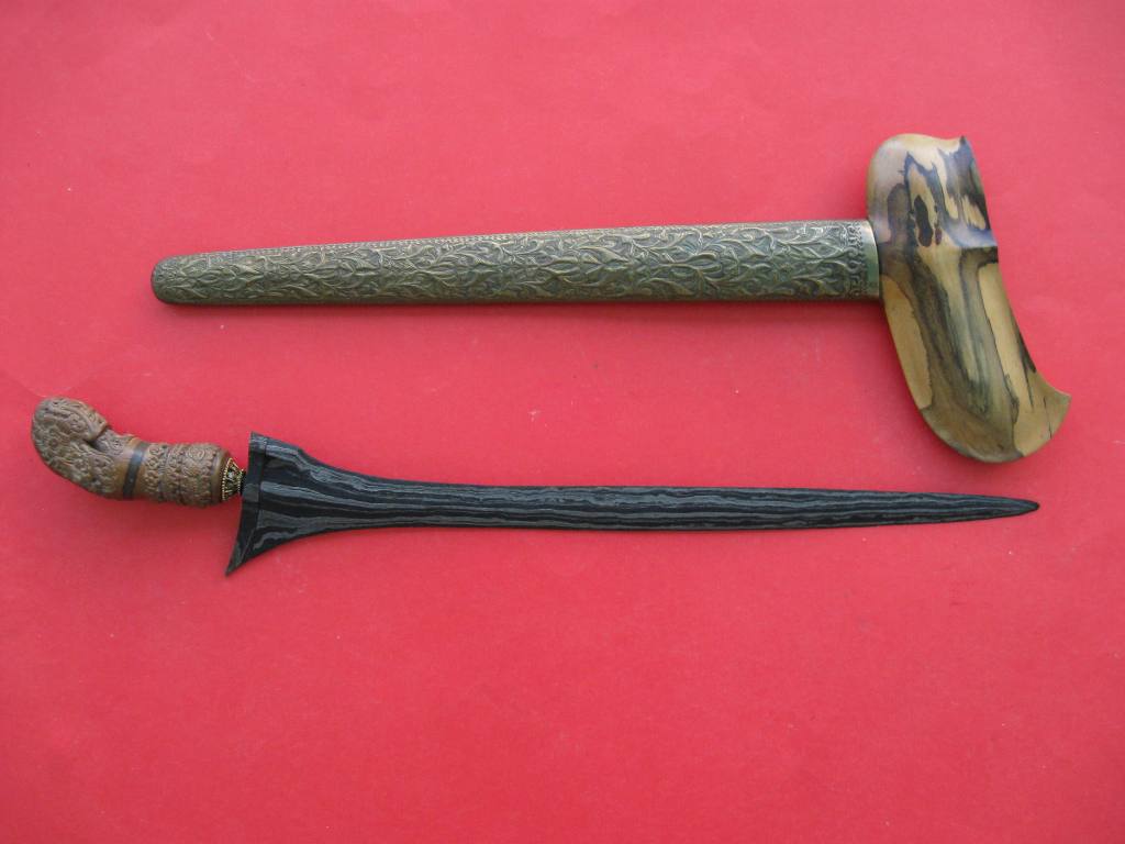 I casually threw out a bid on this keris simply because i liked the hilt. Kind of a bet an forget thing. The blade is nothing exciting and the sheath needs a little re-furbishing. But it was this hilt that caught my attention. And the price was right. Any thoughts?