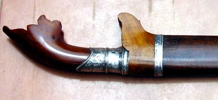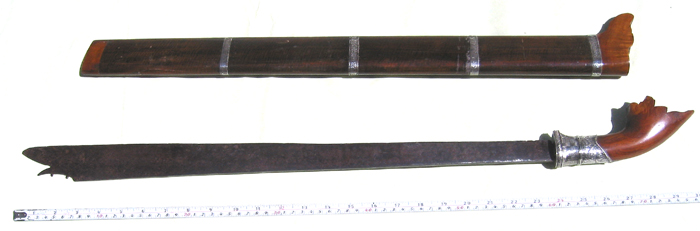 The blade is 91 cm long and has been identified as a kampilan blade but it might have been traded or captured at some time in its history. I attach a scan of the blade tip. The decoration of the grip and scabbard is silver; fairly pure I think, by the way it responds to cleaning. |
