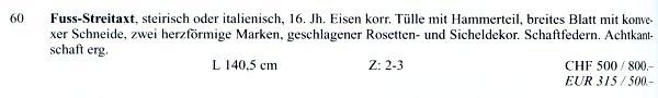 The hafts of most samples I have seen were of ash wood, just as is the case with long spears (pikes), but some were made of oak. By the 16th c., the blades mostly have sturdy spikes to them, often pointing to the rear.