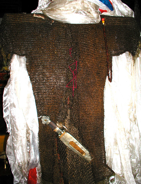 Hilt of sword in Drepung Gompa main hall (hung with inside-out ding jia coat, etc.)