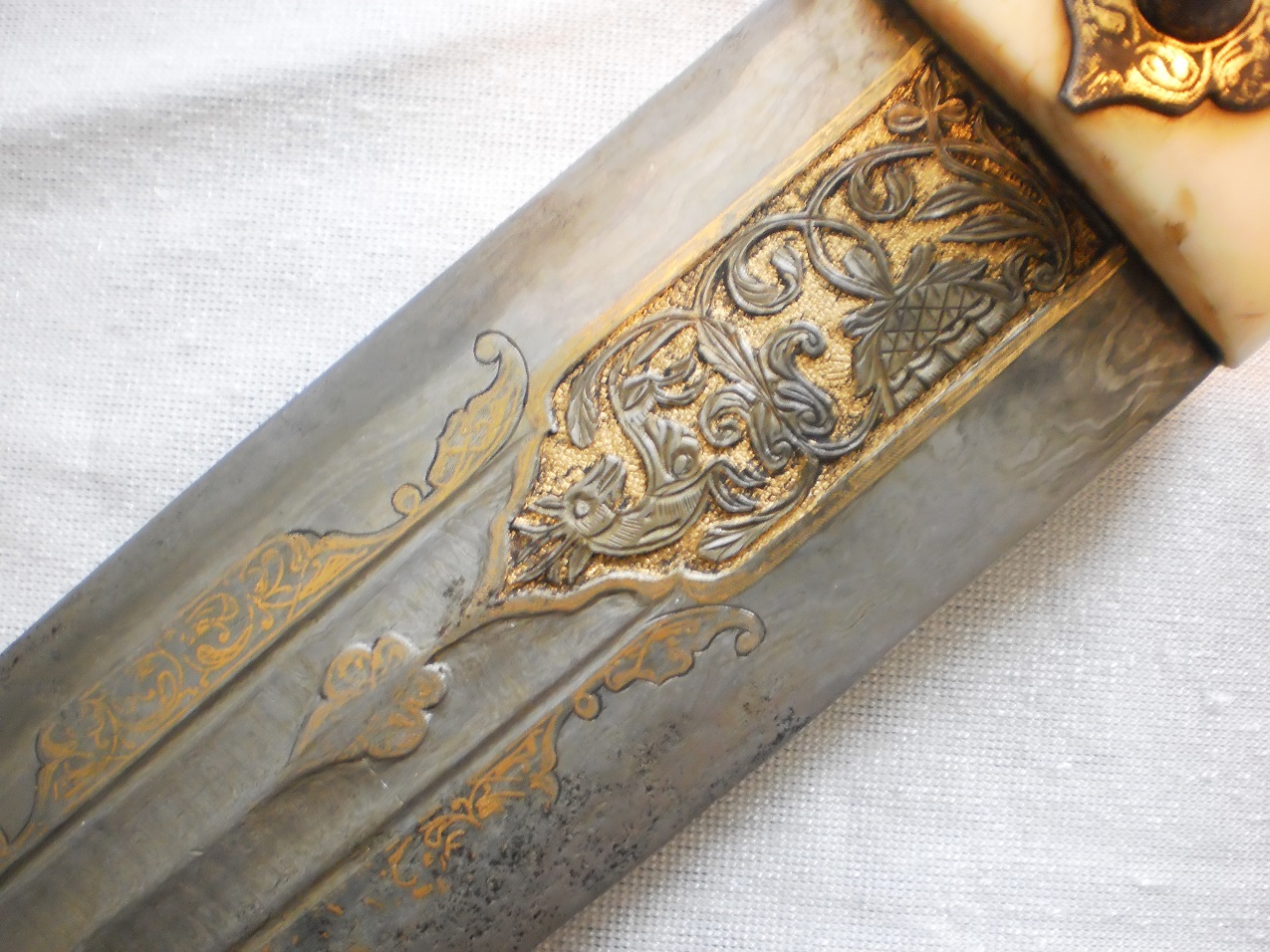 I'm from Germany and I collect antique edged weapons from Europe and Asia and letter openers. In my first post I will show you my most beautiful Qama. It has cutted and gold-backed deers and flowers on the blade which is made of wild damascus with a fuller of ribbon damascus. The gold-koftgari shows a floral dekor. I think this combination of different decorations is really rare and shows the high quality of the dagger. The hilt is made of walrus, the scabbard is shagreen and both have iron mountings with a fine gold-koftgari. Length overall: 50cm Without scabbard: 47cm Length of the blade: 34,5cm I think this dagger was made in the early 19th century in northwest Persia. Are you agree with that?