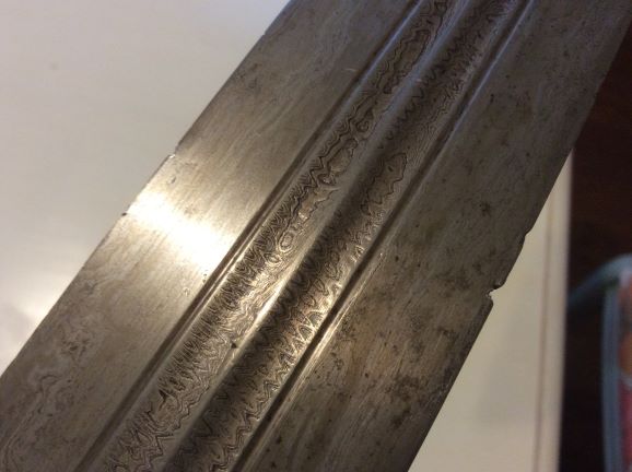 Being offered is a Qama with twistcore central panel and laminated edges. Missing one rivet to the handle. Blade has some nicks along the edge and the very tip is squared off. Lots of pictures of the center twistcore panel. Forged, not etched. Measures 19 1/4" overall and blade is 2" wide at forte. Asking $1200 or open to trades. PM or e-mail me.