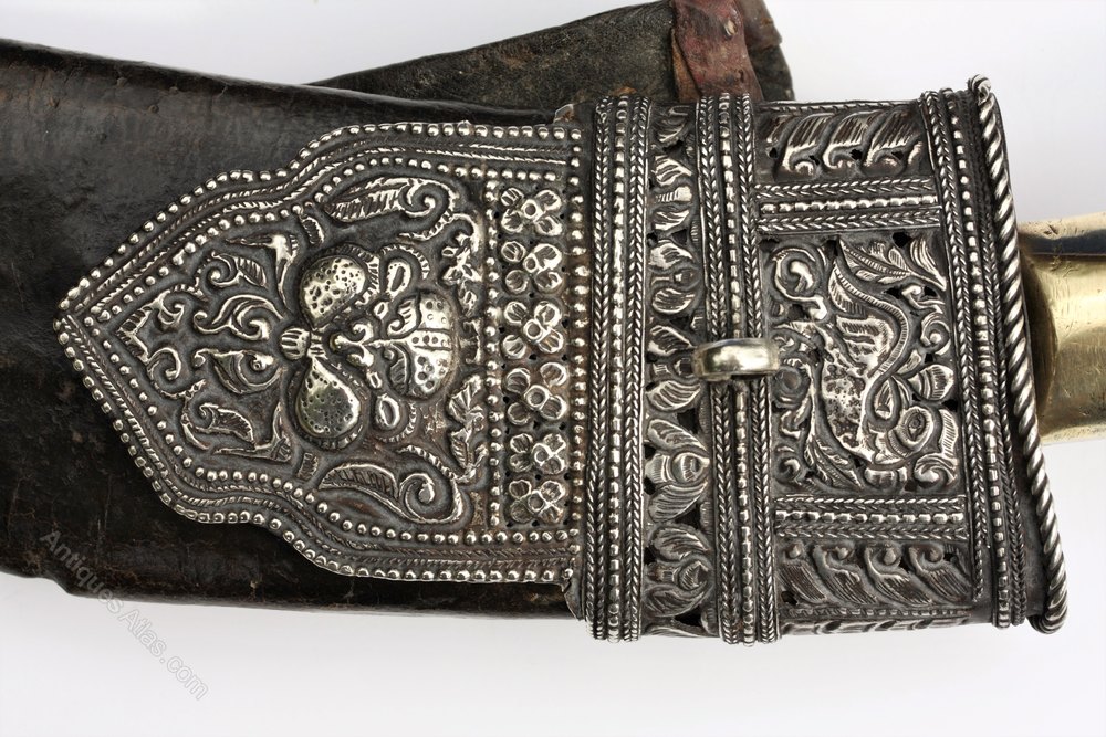 I would like to receive some information about the Kukri here-under. Also I have a few questions: - Do you think the scabbard and the kukri where meant to go together as a whole: the scabbard is about 5cm longer than the blade which seems like a lot to me. - Would anabody be able to guess the date of the kukri and of the scabbard? Do you think it's an antique? - Obviously their is a piece missing at the pommer (I'm guessing a brass plate) however the overall construction seems weird to me: I don't see the tang of the blade instead it seems like their is wood shimmed inside the horn handle. Would anybody have some information on the construction? Please forgive my English it's not my mother tongue |