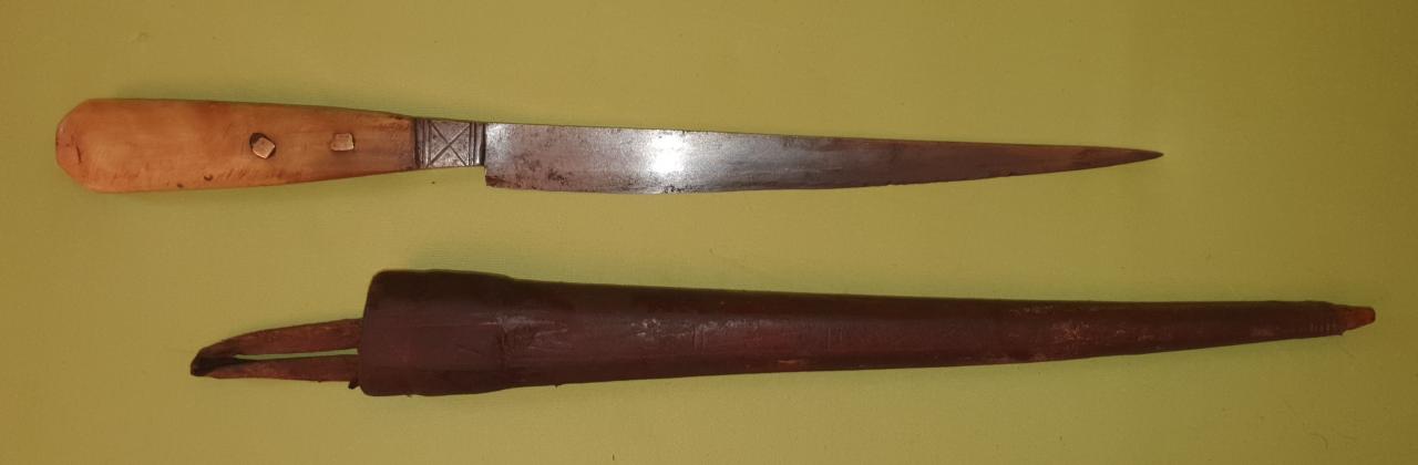 Hello Roano, your new knife comes from Algeria and is called "Bou Saadi" from the name of a city where it is produced, or Khodmi; it was used by the shepherds of the Kabilya tribes to slaughter the sheep... The handle can be made of wood, or bone or horn, as I think yours is.