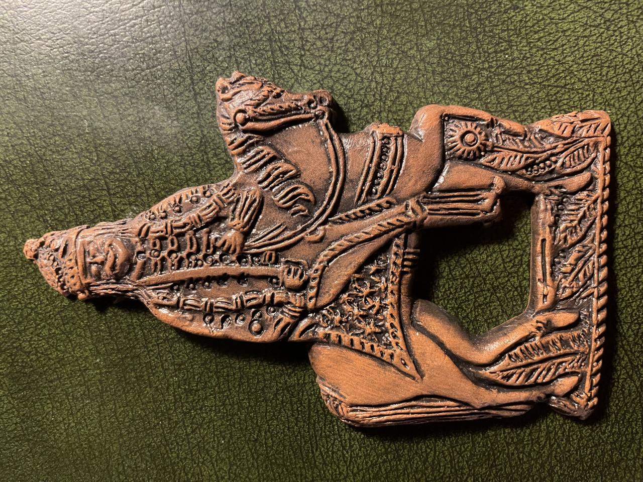 I bought this souvenir when I was in North-Western Croatia , Zagorje-Krapina county for a few days vacation. On the back it states (I believe using Google transl.) that its a ceramic decoration from an 18thC wooden mould. That would make the original piece similar to the object under discussion.