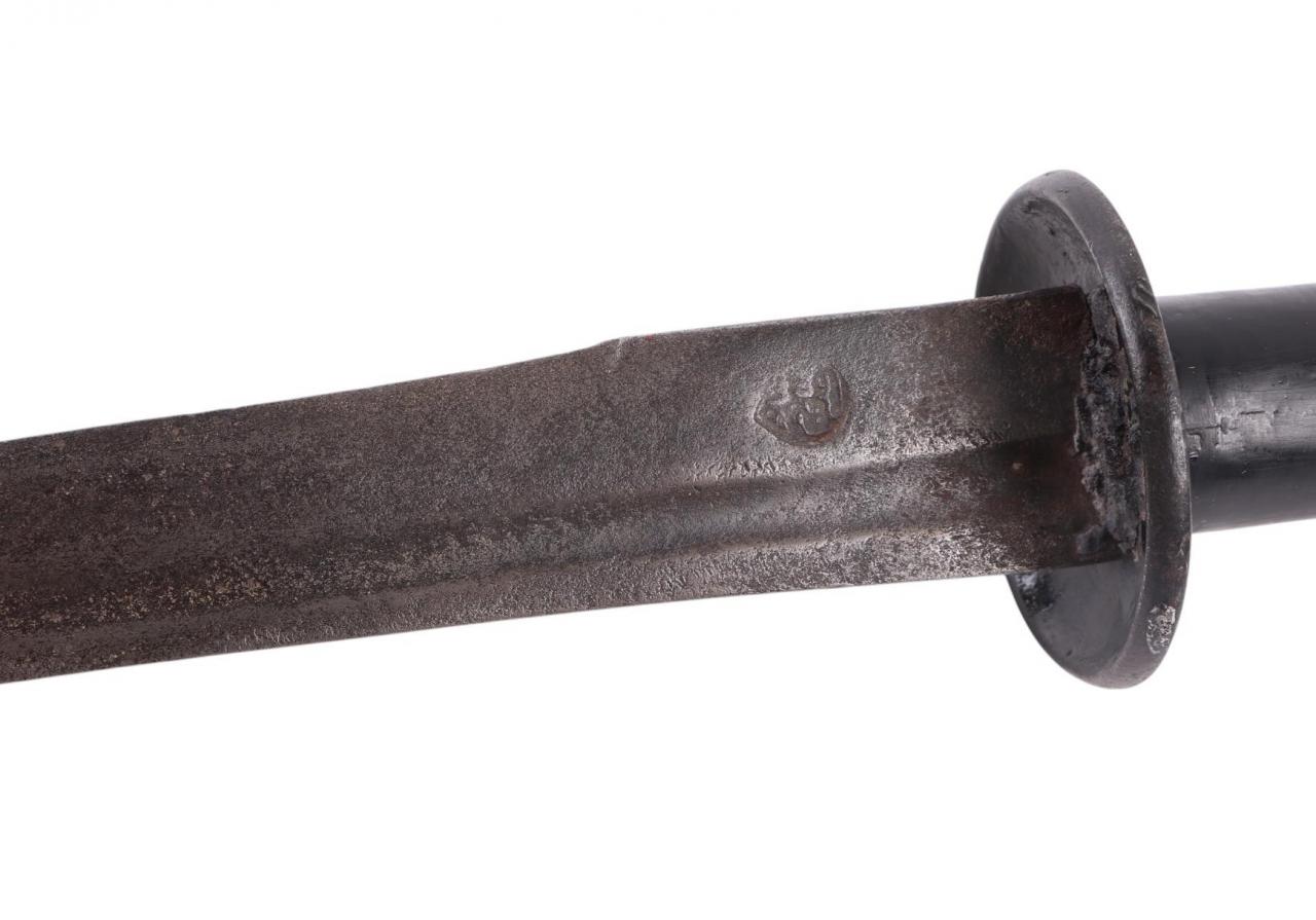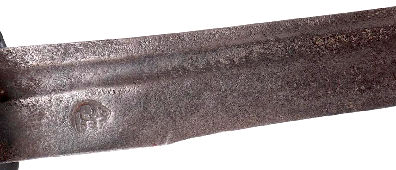 Here is a rotated and enLarged picture of the stamp on the ricasso. The blade appears to have some age in line with Jim's estimate. Anyone recognise the stamp? What is the likelihood that this could be a wootz blade? There are areas near the junction of the ricasso and sharpened edge that look promising, and if Jim's date estimate is correct then the chances are good.